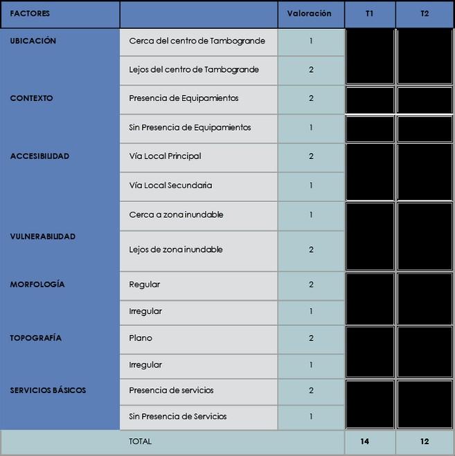 De acuerdo a los Factores empleados en la ponderación de los terrenos, el Terreno 1 es el elegido ya que cuenta con las puntuaciones más altas. Está ubicado lejos del centro de Tambogrande,que es justamente lo que estamos buscando para favorecer a las demás zonas y C.P aledaños, tiene fácil acceso, está medianamente lejos de las zonas inundables y cuenta con los servicios básicos necesarios para que funcione el equipamiento.