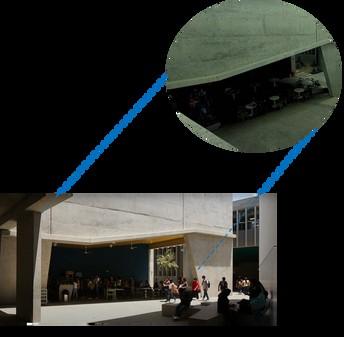 La Cafetería es un espacio social que está situado en las sombras de uno de los bloques independientes del Aulario, el cual queda sin la suficiente luz natural que requiere, por lo que no es el espacio favorito de los estudiantes.