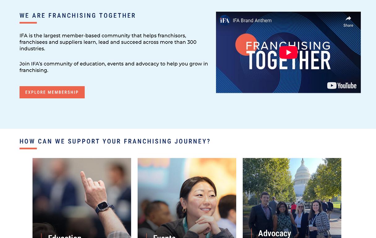 IFA is a trade association representing 1,200+ franchise brands and their franchisees and 600+ supporting suppliers. We are the only organization that promotes, protects, and strengthens the franchising business model worldwide. Through best in class educational events and webinars, widely distributed publications, and a proven government relations team, we accomplish goals of our individual members and the collective industry.