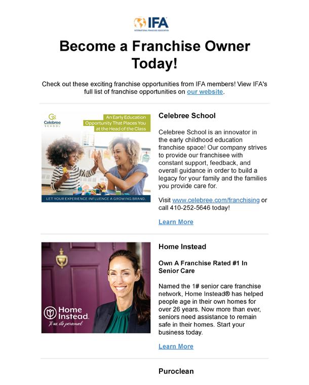 Our “ Franchise Opportunities for You ” is a combined e-blast that includes a maximum of six advertisers per email. Perfect for ongoing campaigns and starter opportunities, this affordable e-blast gets in front of 33,000+ prospective (and active!) franchisees.