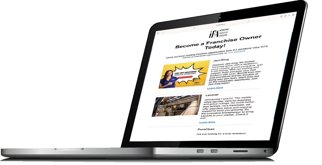 Sent on your behalf from the IFA, the Dedicated Prospective Franchisee E-blast shines an exclusive spotlight on your business and ensures that 33,000+ prospective franchisees get your undivided attention. Great for time-sensitive, high-impact campaigns.