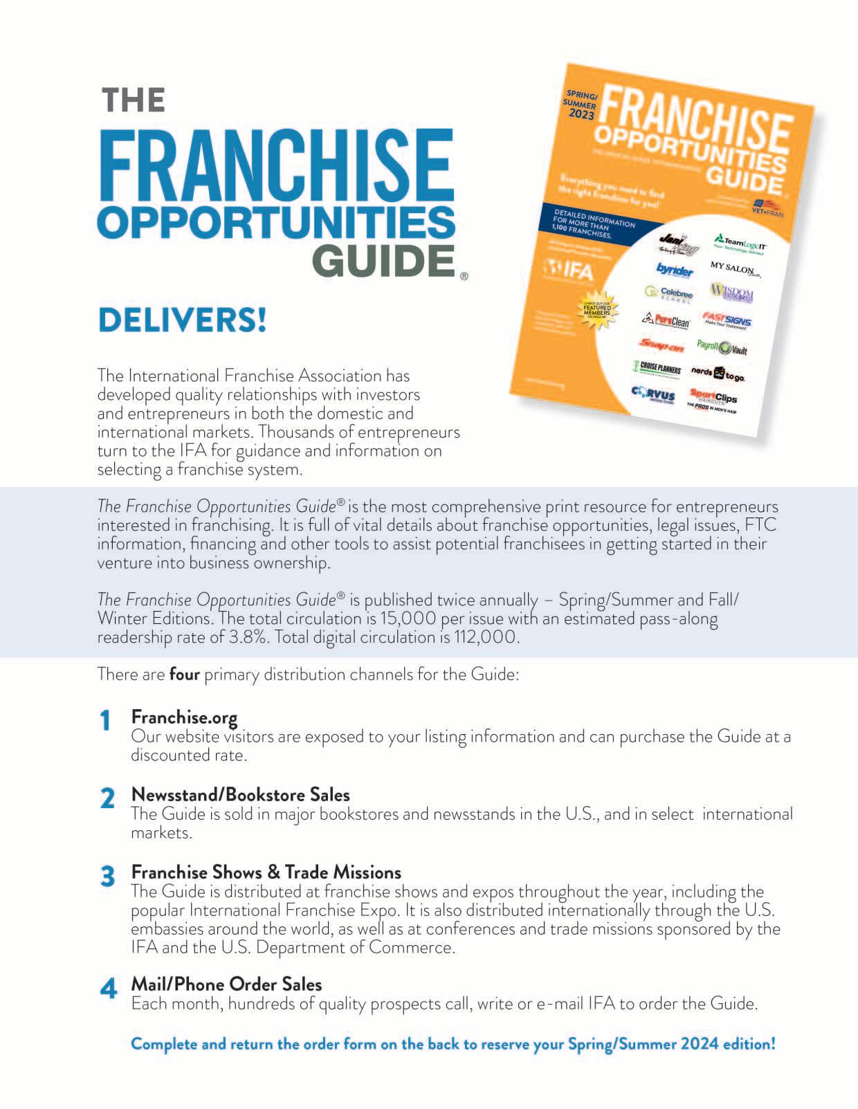 The International Franchise Association’s Franchise Opportunities Guide contains detailed information for more than 1,100 franchises — all members of the IFA. The guide includes everything you need to start the search for the right franchise for you.