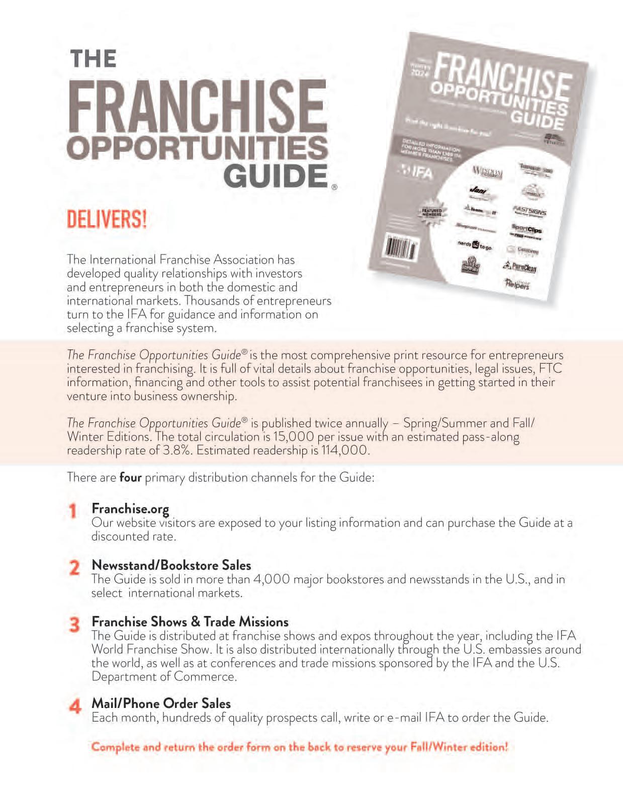 The International Franchise Association presents this Guide to help individuals find franchise opportunities. The guide is a comprehensive resource that describes the many reasons franchising is an excellent way to be “in business for yourself but not by yourself.” It also helps you determine if franchising is right for you and the common mistakes people make when deciding to purchase a franchise.