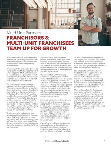 on their success and offer their stories and insights to our readers. And up close and personal at our annual Multi-Unit Conference, they have shown a generosity of spirit through impromptu conversations and on-the- spot mentoring. This edition of the Multi-Unit Buyer’s Guide to Franchise Opportunities is a resource for connecting expansionminded multi-unit operators with like-minded franchisors. The following pages, filled with concrete information from franchisors, is intended to help you evaluate new opportunities to diversify your portfolio of franchise brands. The franchisors listed in these pages understand multi-unit franchising and are actively seeking experienced operators to help them penetrate new markets, quickly and effectively—and you’re looking for the best brands to help your franchisee organization grow. We hope this guide helps all involved. New and prosperous partnerships could be just a few pages away!