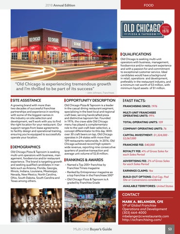 RANKINGS & AWARDS • Named a Top 200+ franchise by Franchise Times magazine • Ranked by Entrepreneur magazine as a top franchise in the Franchisee 500® • Old Chicago Pizza & Taproom is A graded by Franchise Grade