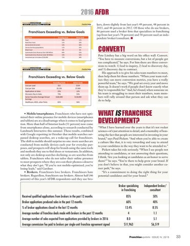 2016 AFDR kers, down slightly from last year’s 49 percent, 48 percent in 2013, and 44 percent in 2012. Of those who do use brokers, 86 percent used a broker firm that specializes in franchising (up from last year’s 78 percent) and 58 percent used an independent broker/consultant. n