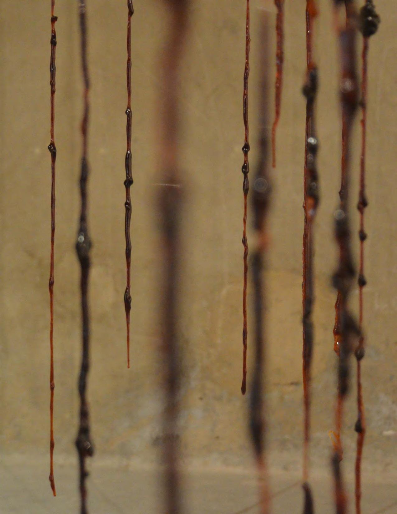 Stalactite are mineral formations that begins to be created with a simple drop of water that when it falls, leaves behind a fine trail of calcite. 5 kilos of sugar were turned into caramel stalactites. Drops of candy were watered one by one until their accumulation formed a narrow tube. These structures, never solidified, continue to release drops that fall over cups and plates located on the floor, dishes from different owners, warehouses and wineries that are reunited in dissimilar sets.