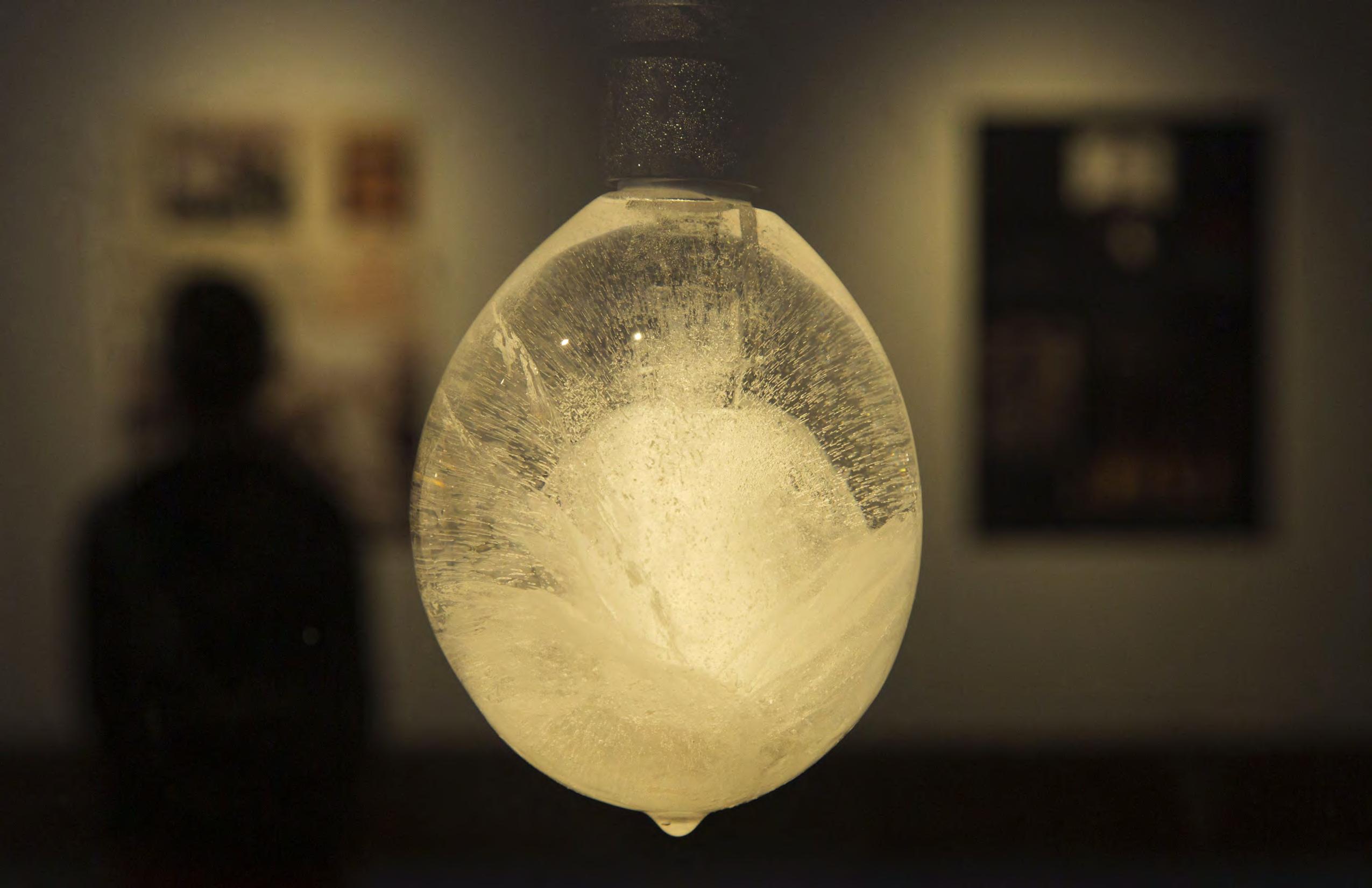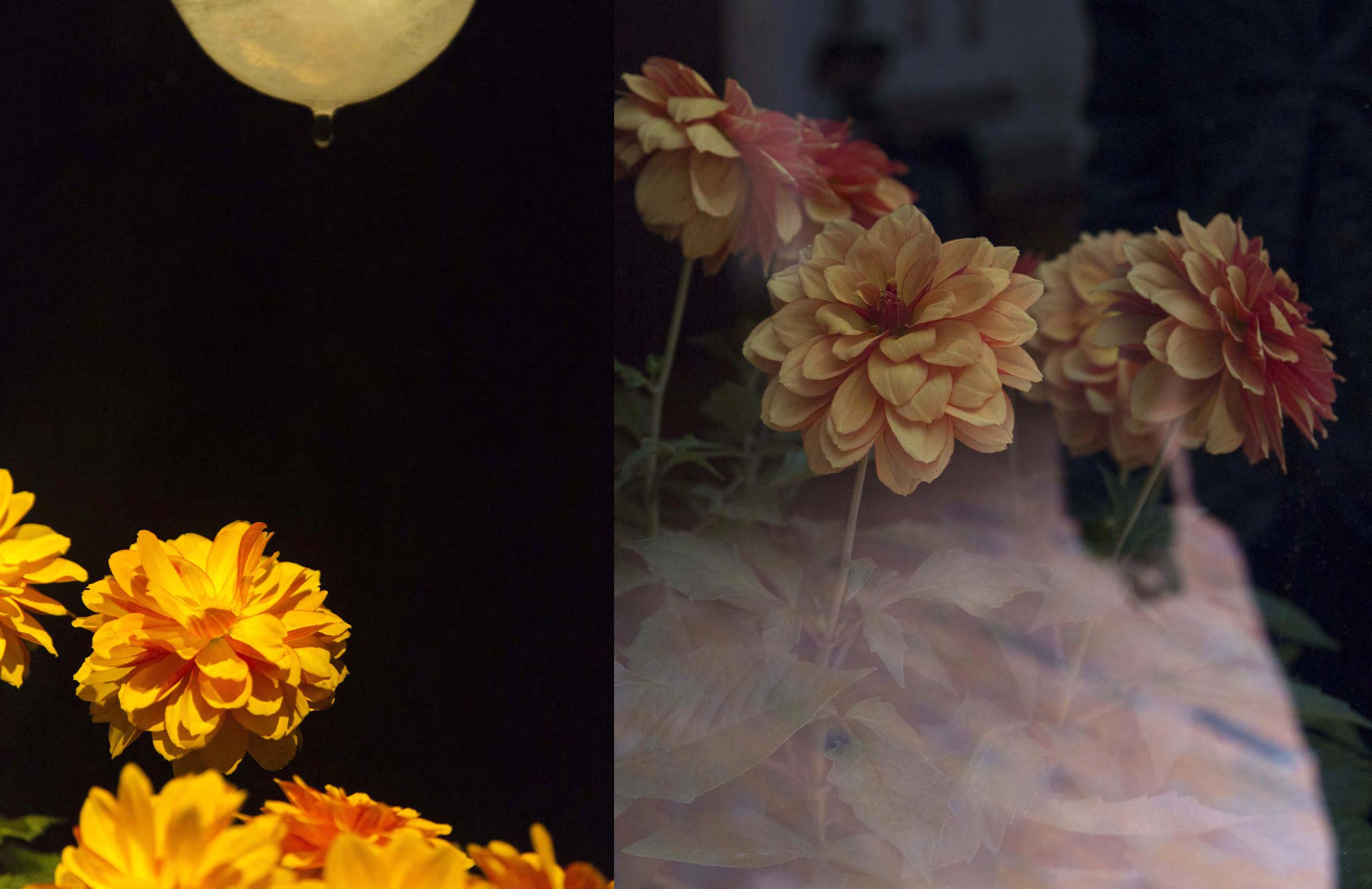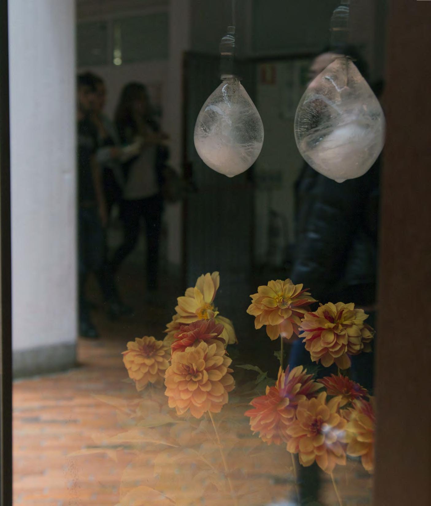 Ice bulbs as energy sources hang on a flower arrangement. After a period of 24 hours they completely melt over the flowers. Light bulbs, flowers and ice, symbols of the fragility and brevity of life, come together in a Vanitas of constant transformation and darkness.