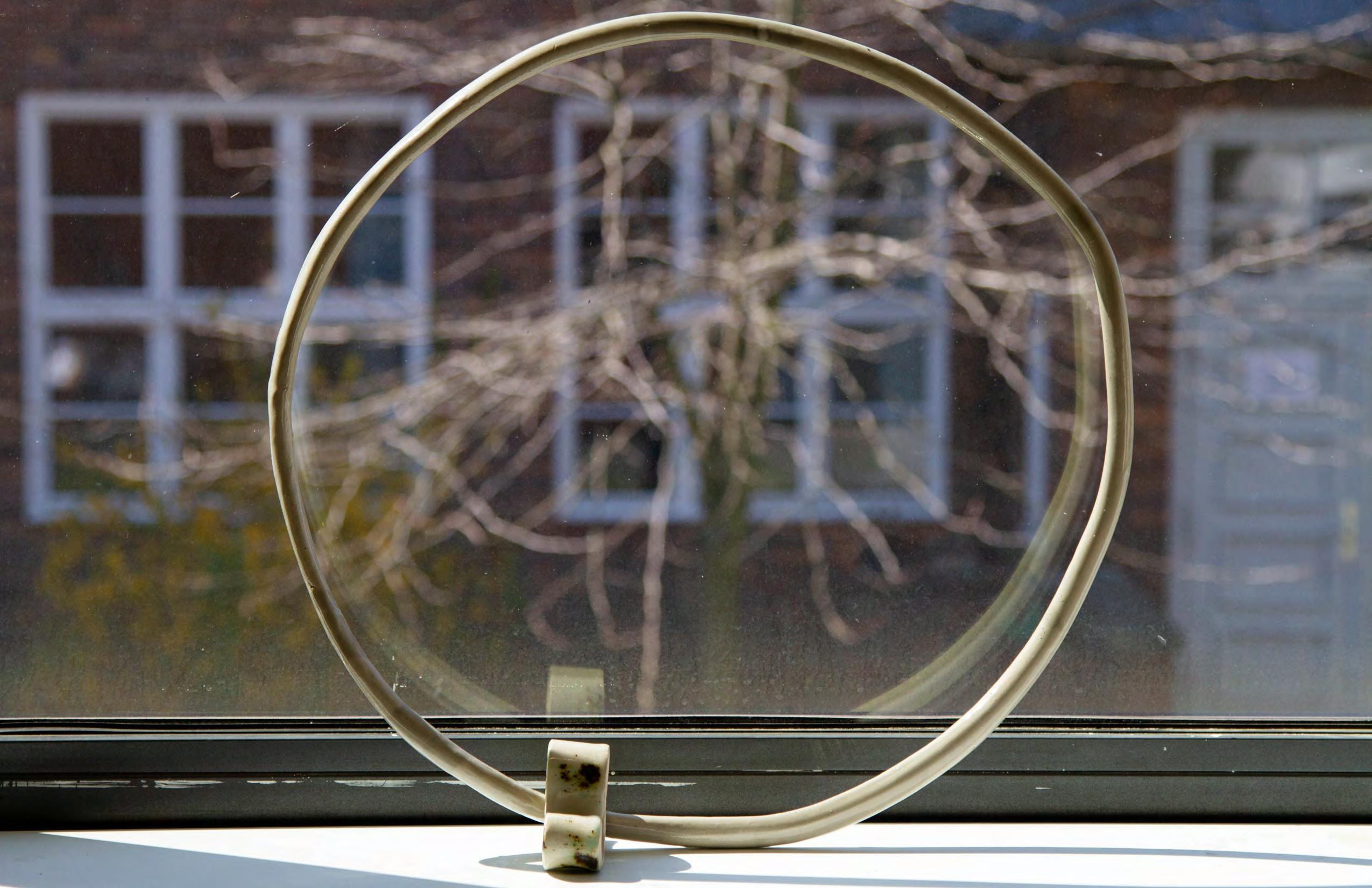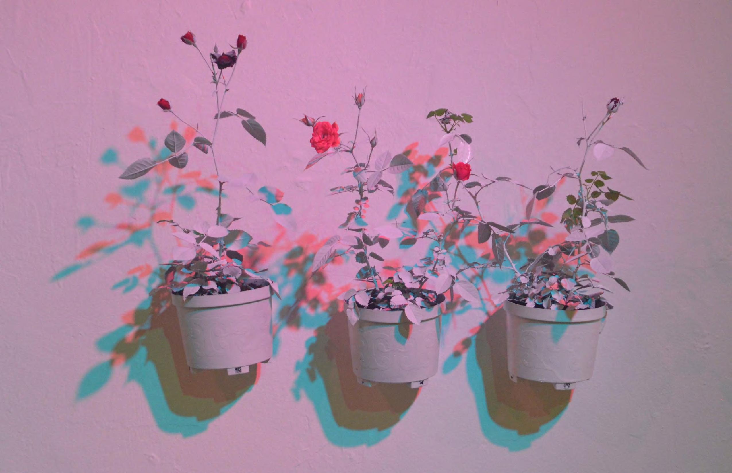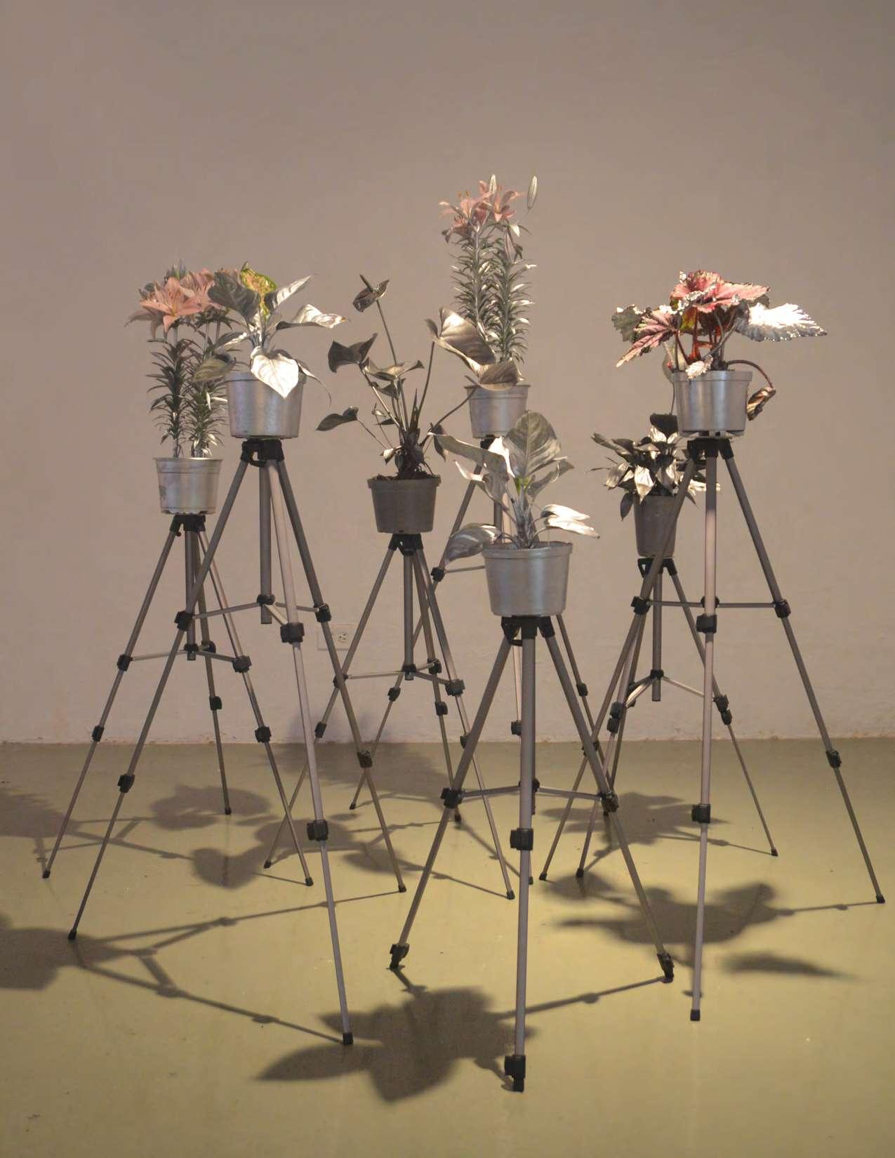 Home plants were covered with metallic paint. After several months, new leaves emerged, these shoots differed from the previous ones due to their color. A hybrid being was born, where the “artificial” and the “natural” coexist and create colored halos. Time was made vissible.