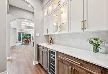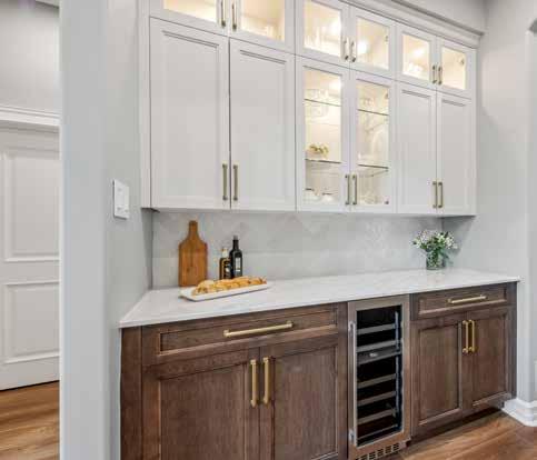 just off the kitchen, seamlessly connecting your kitchen and family room, for example, while remaining visible from your dining and living areas. In this case, the bar’s cabinetry will be a continuation of the kitchen’s finishes, creating a cohesive look throughout the space. The ideal kitchen bar design can have a