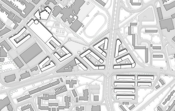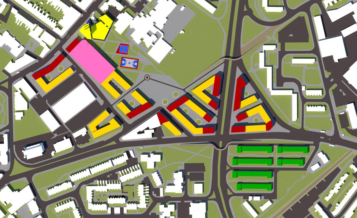 There will be a mix of green space throughout the masterplan with Interactive green spaces such as parks and urban green furniture as as Visual green spaces used shaping spaces around buildings and making barriers between pedestrians and roads. The masterplan will incorporate green spaces within the urban spaces. These areas will be located in the courtyards of resident blocks and provide a mix use space for pedestrains to call their own. These hybrid areas will be targeted to families with children; play areas which can be overlooked by the flats are higlhly valued by the community as it allows for safer spaces.