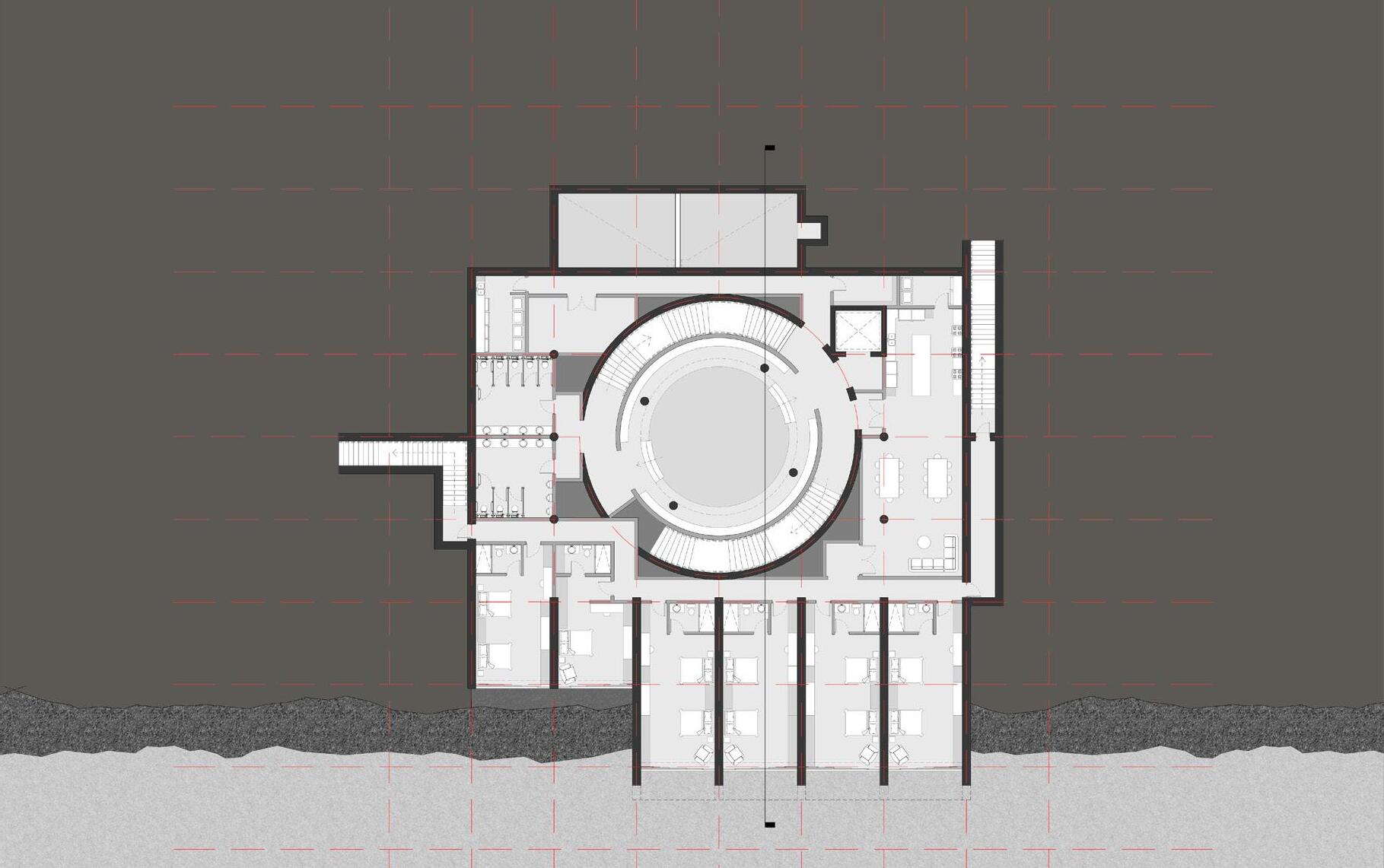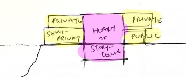 The heart of the building is for public storytelling. Accessible from all areas of the building. Guests will have to pass through the area to get to other places in the centre. The heart of the building is the most important area for storytelling. A gathering point, a meeting point, a place to think and develope ideas.