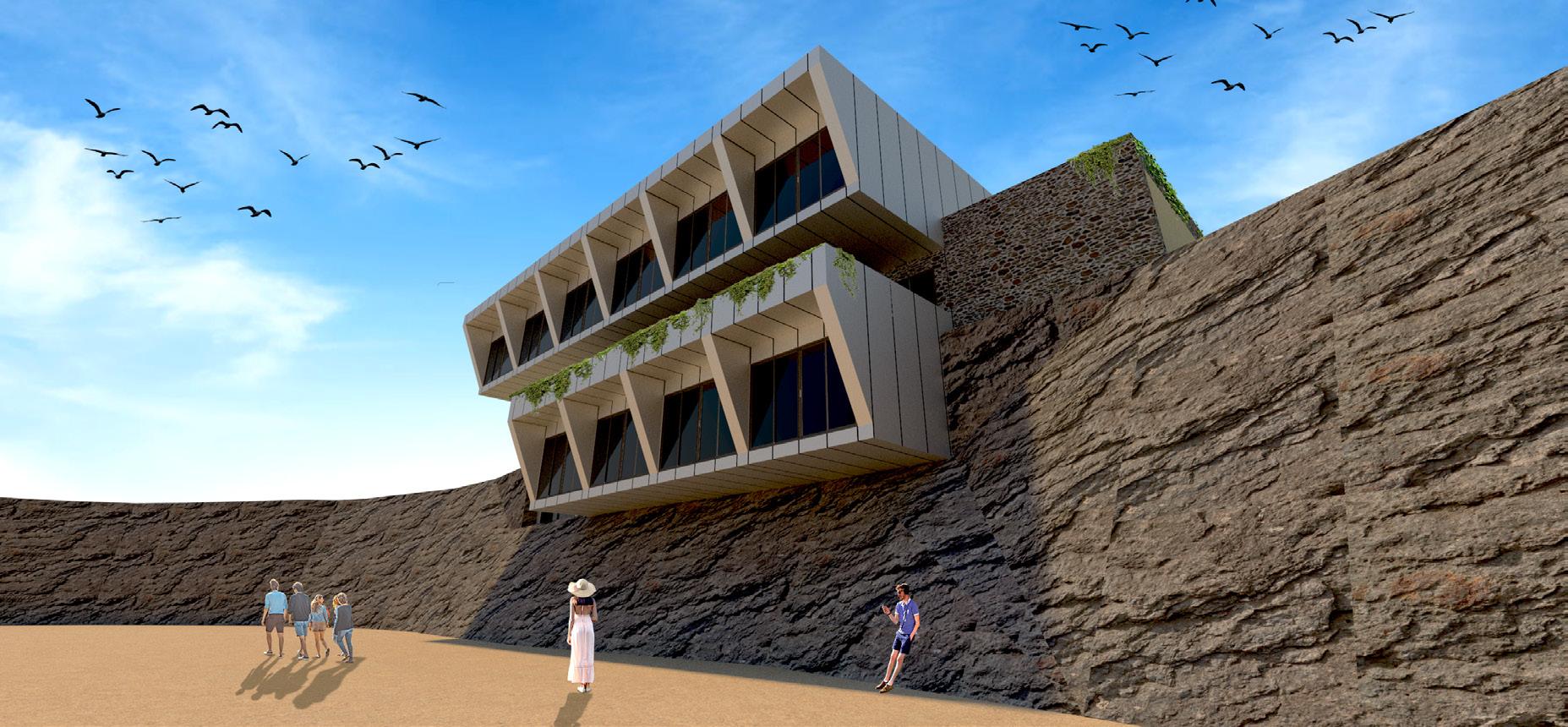 Less obstruction of landscape, the building will not standout from oncoming roadways. There is direct access from upper green space on to Clogher Strand. Building to feature materials of the coastline: Living walls, stone, plaster board to represent sand and wat er features and floor to ceiling windows and doors on to beach. The site is additionally close to existing roadway which provides direct access to motorways and the main access point tothe strand. The building location is sheltered from western peninsula which protects again harsh winds as the site can fairly exposed to the south.