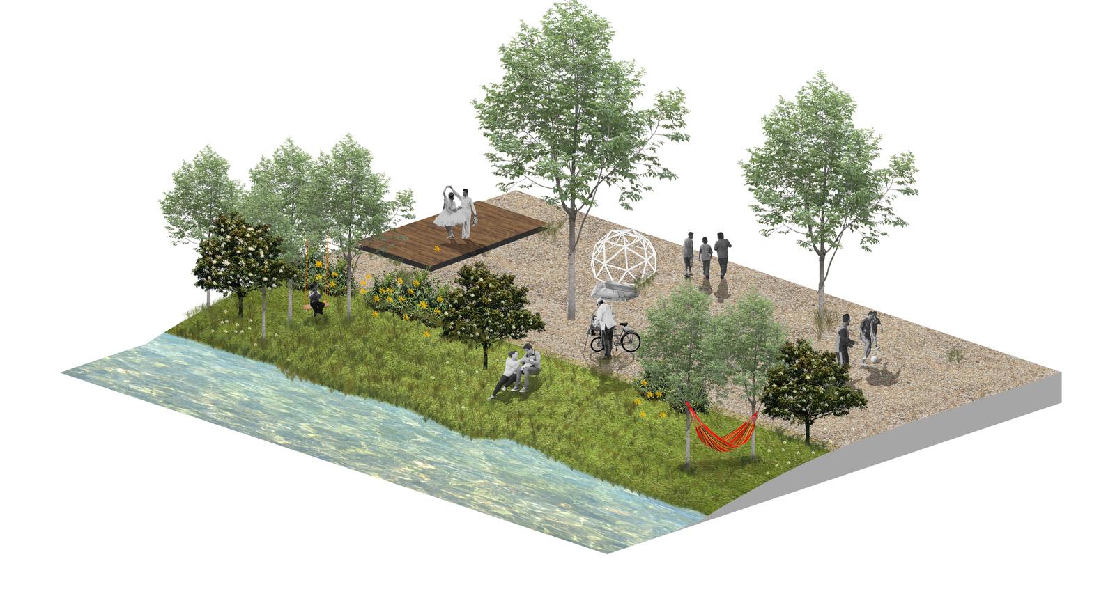 Se busca preservar la acequia evitando ser invasivos con el paisaje, por lo cual se buscan elementos de descanso y juego donde los árboles cumplan la función de estructura.