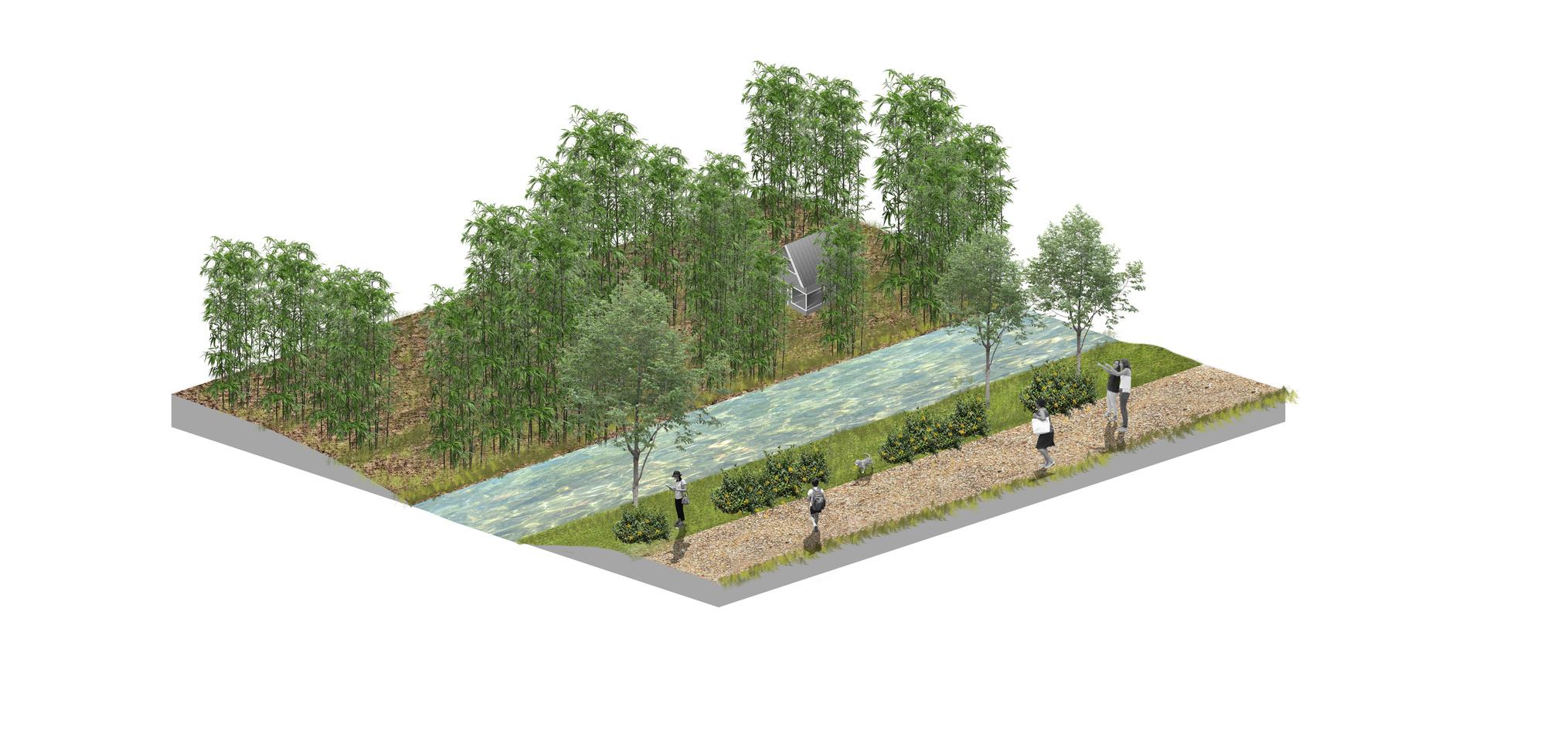 Trayecto C: Es el final del parque lineal e inicio del camino hacia los manantiales. Del lado derecho, cruzando el arroyo, nos encontramos con sembradíos ya existentes de bambú, creando un paisaje único. Es un momento/espacio para la contemplación y concientización. Se busca trabajar con este material para la creación de mobiliario urbano dentro del parque y al tener el sembradío al final del trayecto, nos permite ver el bambú en su estado natural, no como material si no como materia viva.