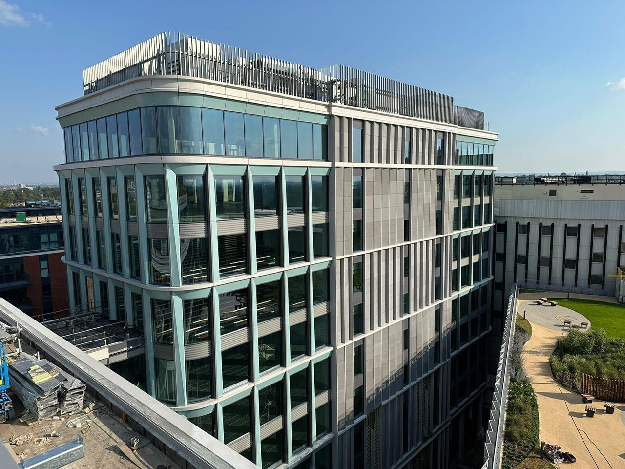 On Building B - MEP install is complete The stick system glazing is complete on ground and 1st floor. Otis have installed all lifts Equitone façade is complete.