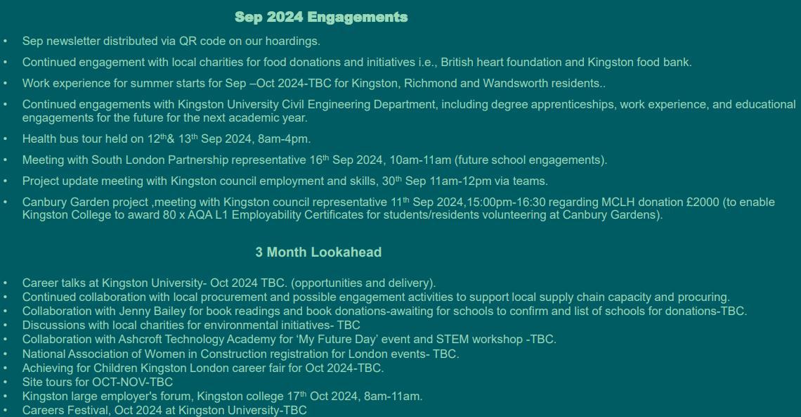 MCLH have now issued to the Council confirmation of their procurement of 15% of works in the local area as well as their current status of local employment. We have had several queries from the Council which have been responded to.