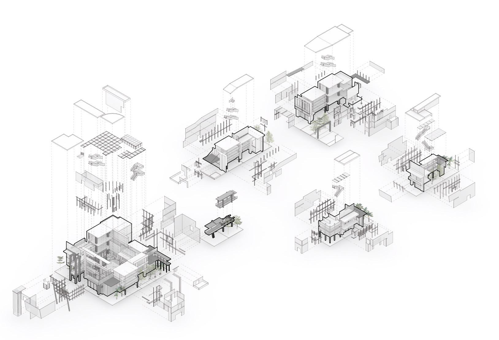 The multi-function space is the outcome of an algorithm. This process considers the spatial properties of the urban fragments and juxtapose them according to their similarities. Instead of visually coherence, the generated space blend into the environment according to the continuous spacial experience.