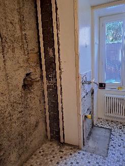 Problème : comment enlever ce robinet ? Nous ne trouvons pas de vanne pour couper l’eau de l’appartement. Un téléphone au sanitaire et surprise, il faut couper l’eau de trois immeubles ! On en profite alors aussi pour démonter le matériel de la salle de bain pour qu’elle puisse retrouver une jeunesse. Une chose de faite, reste à démonter le placard et refaire les murs. Pas tout à fait comme prévu ! Les murs sont en pierre; le liant est vieux et de mauvaise qualité, tout s’effrite, il va falloir doubler…