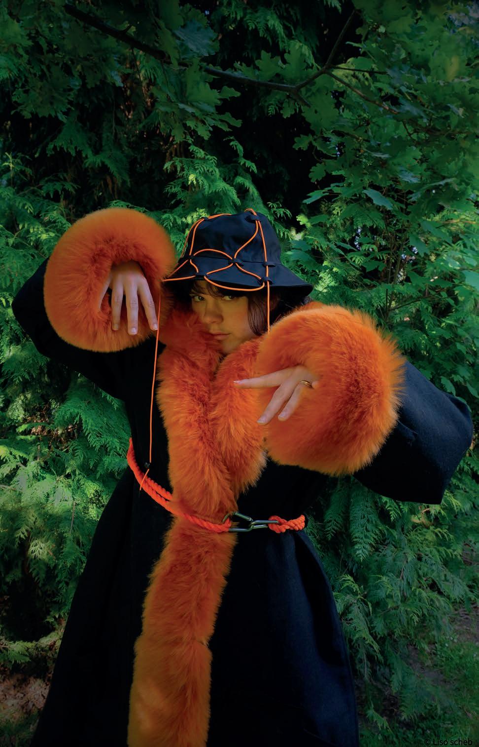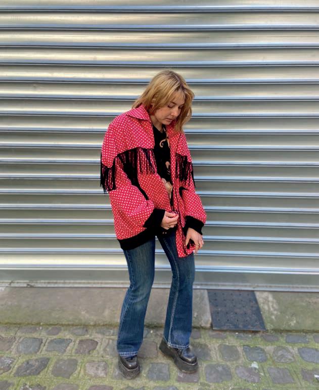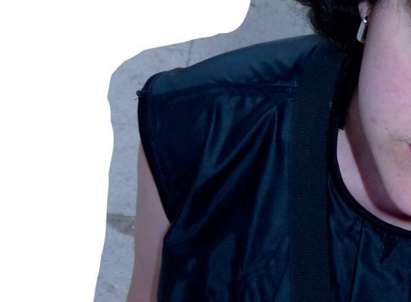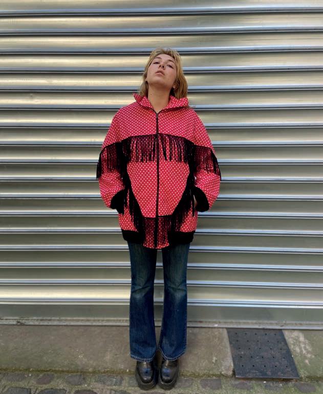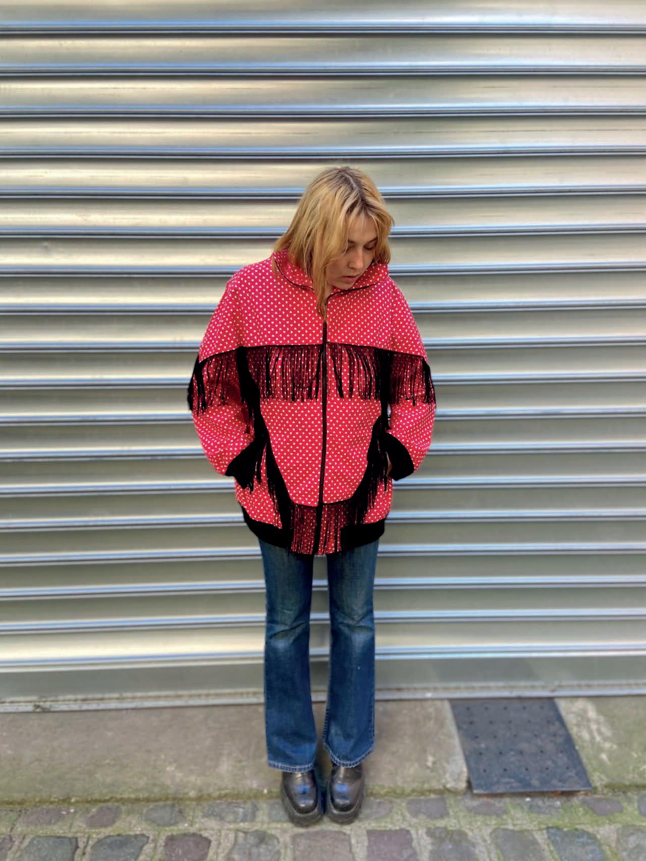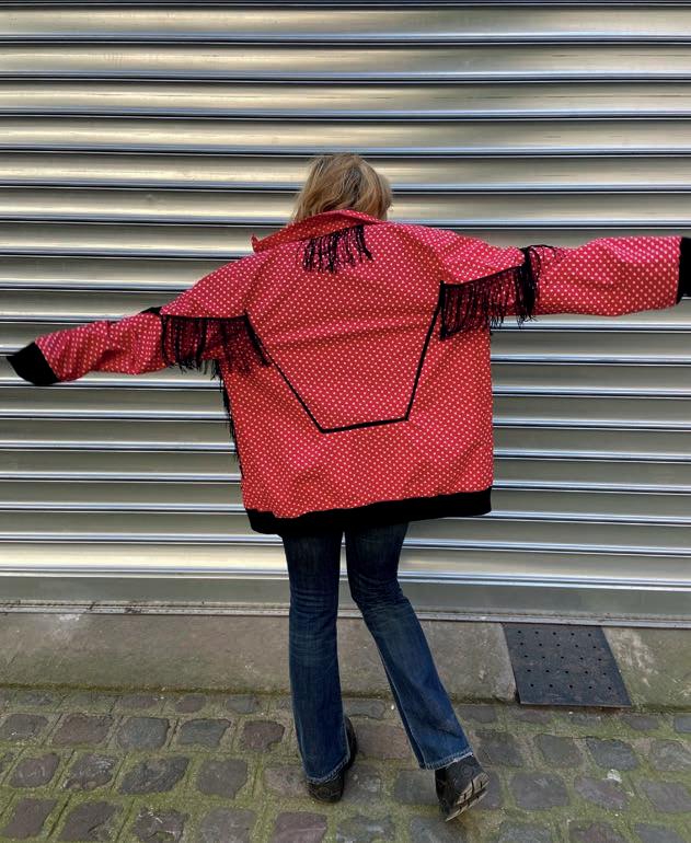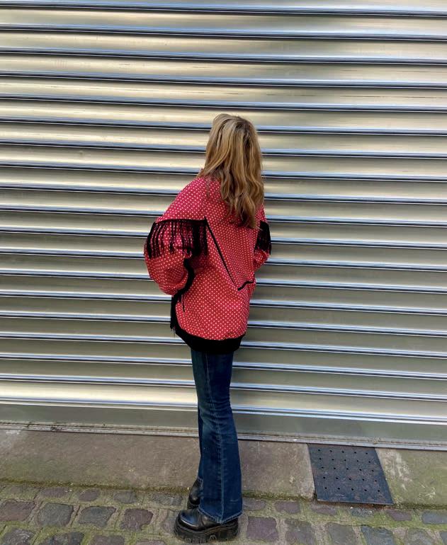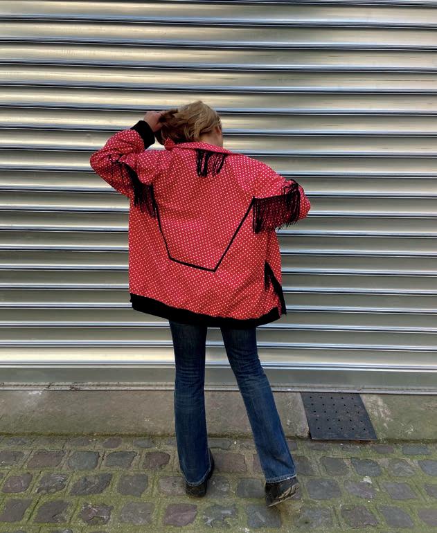 En deuxième année, à l’occasion de l’apprentissage du coupe-vent et des biais, j’ai dû créer un coupe-vent avec du tissu recyclé et des biais de mon choix. J’ai donc intégré des franges à ma pièce.