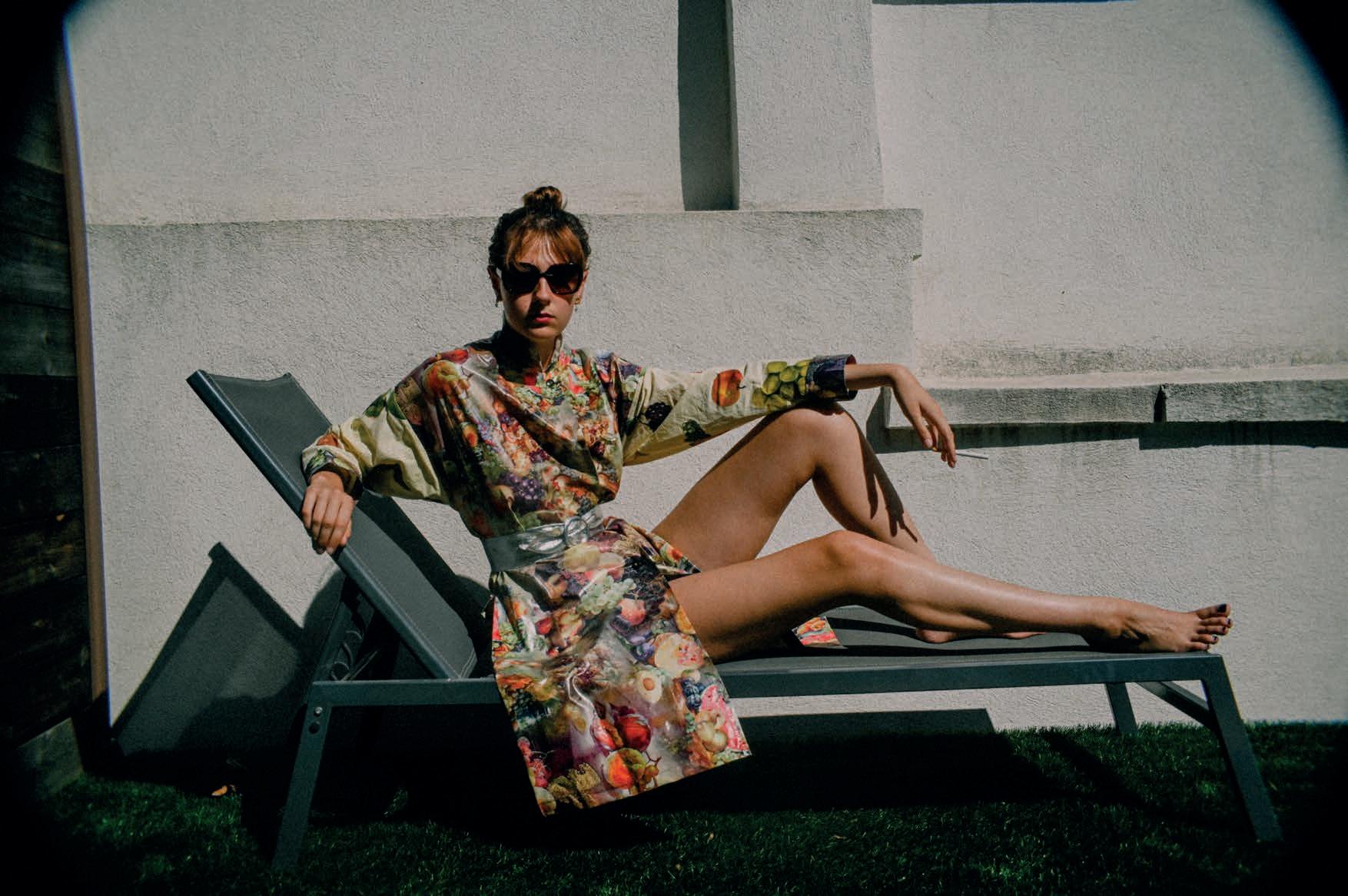 Ayant choisi le thème du pique-nique, j’ai cousu une robe en toile cirée avec des motifs fruités rappelant les nappes des grands-mères.