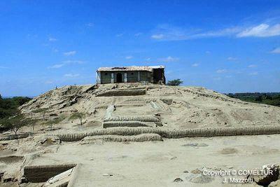 La huaca presenta una arquitectura de carácter monumental de adobe con argamasa de barro