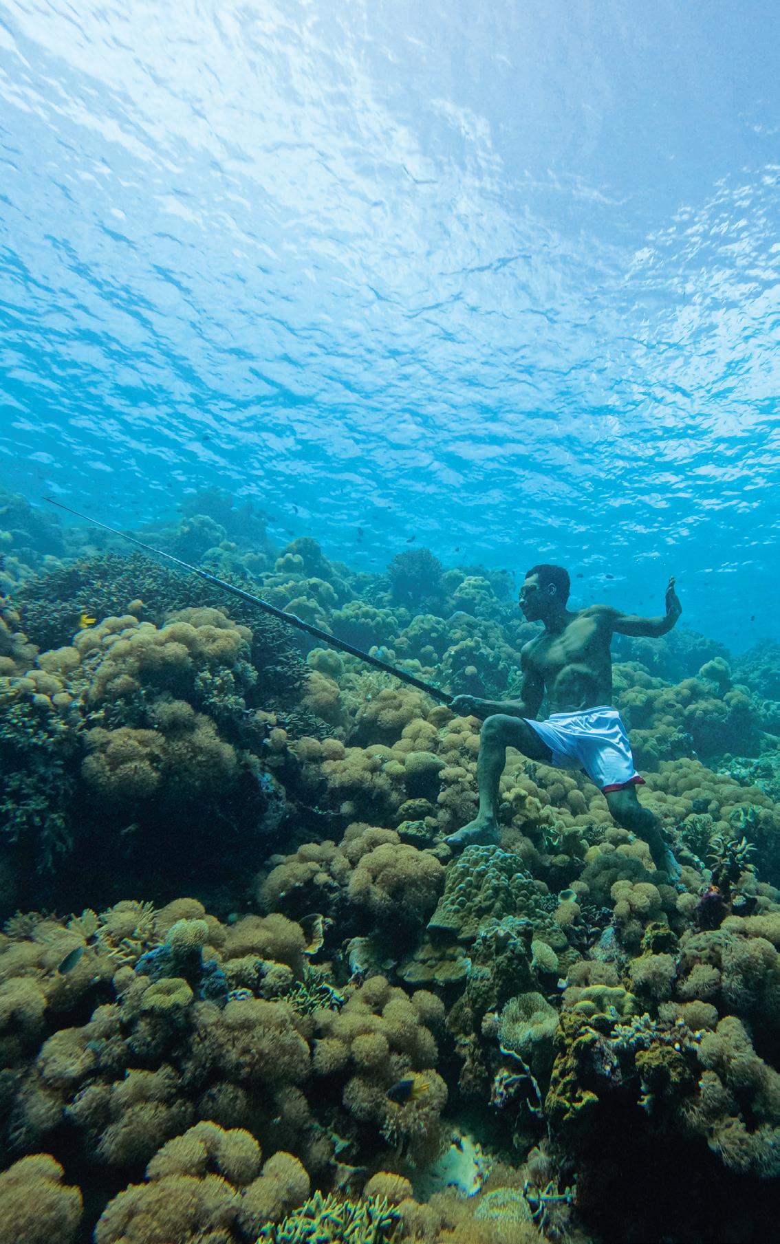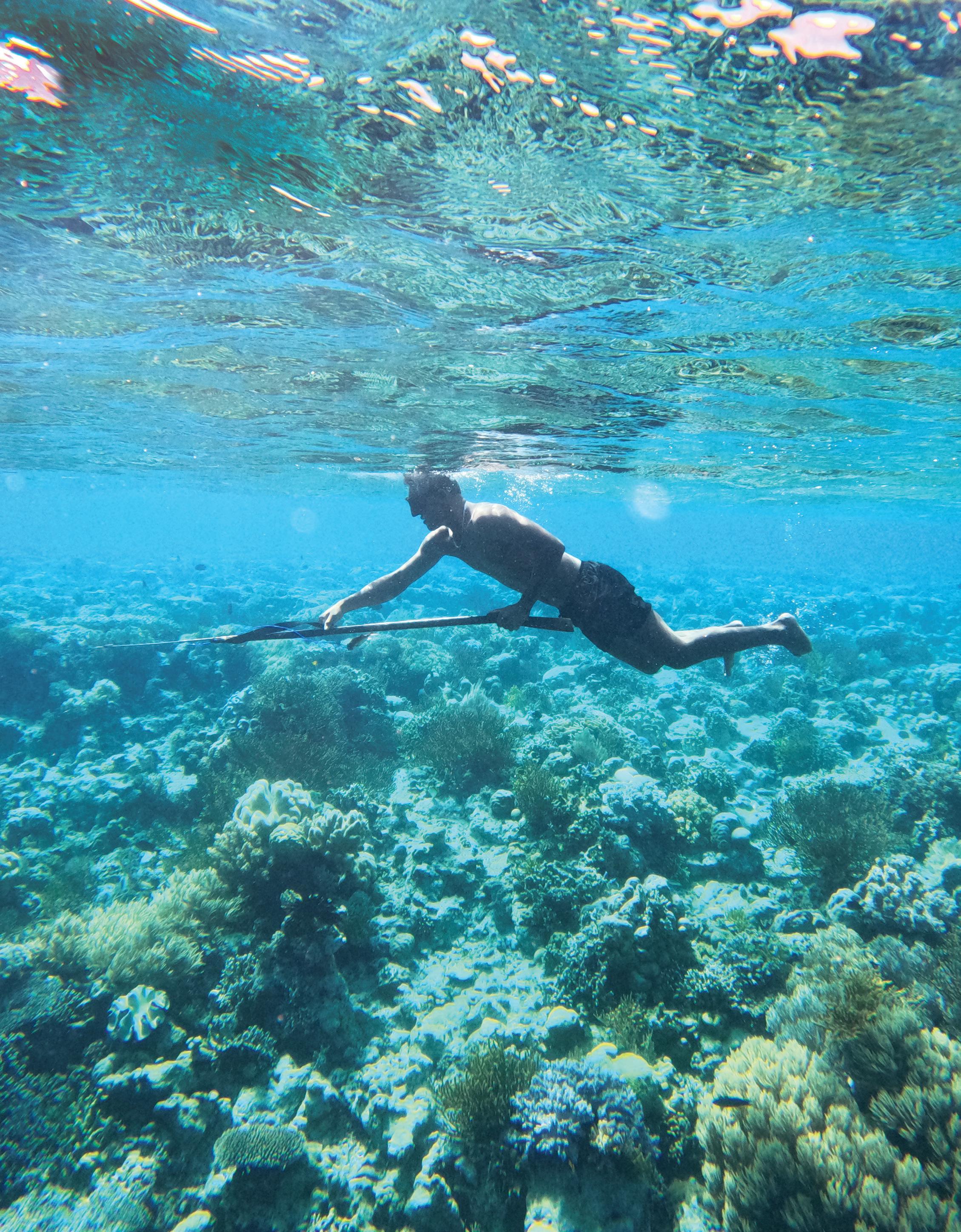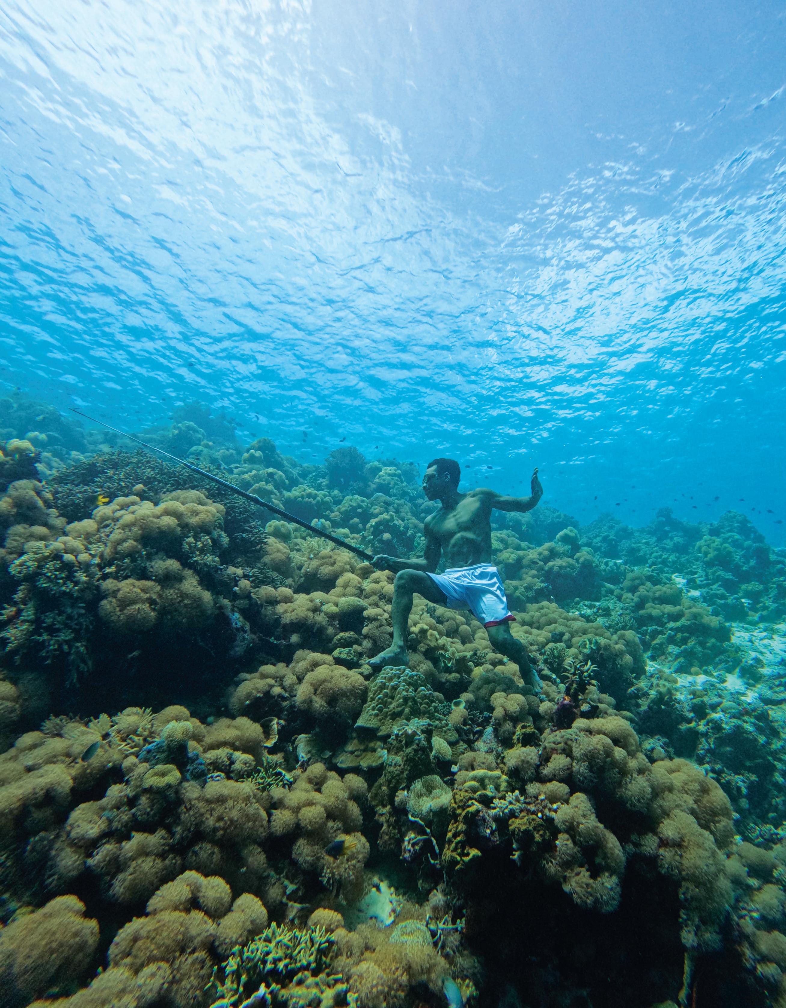 He dived over and over, holding his breath for unfathomably long spells, until under our watchful gaze he took aim, fred, and resurfaced holding a yellow angelfsh he’d struck square on its side.