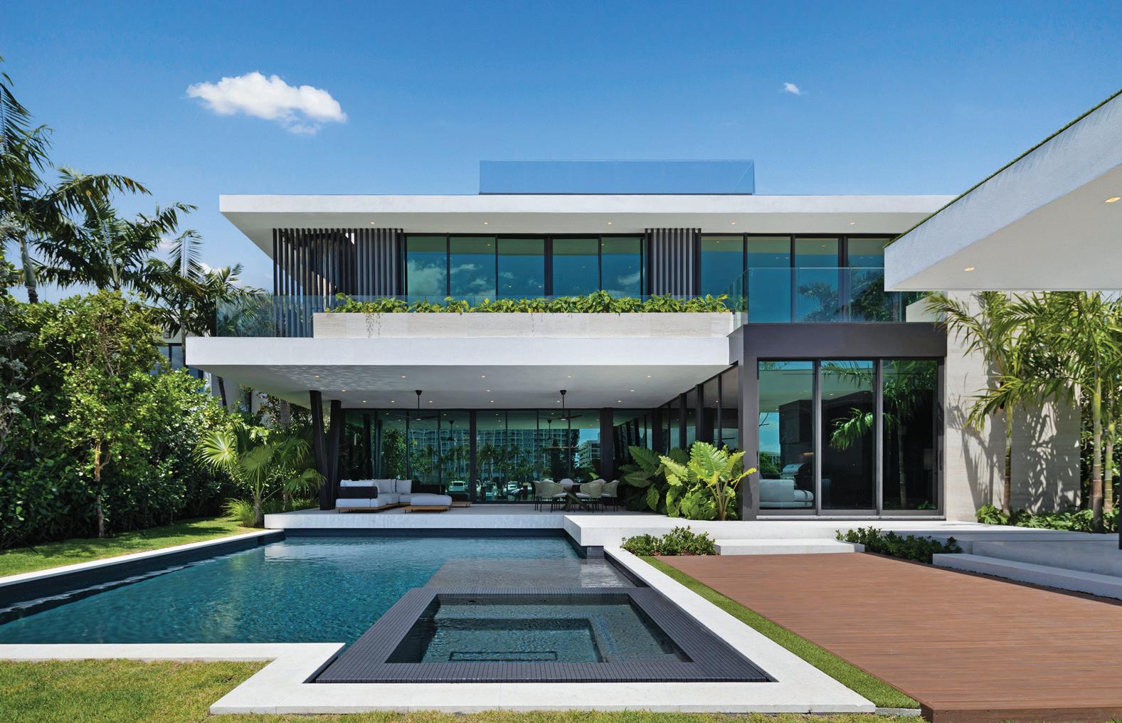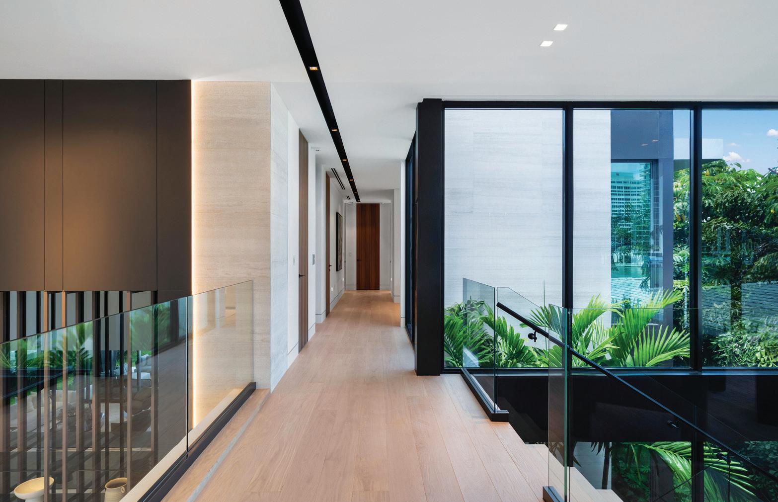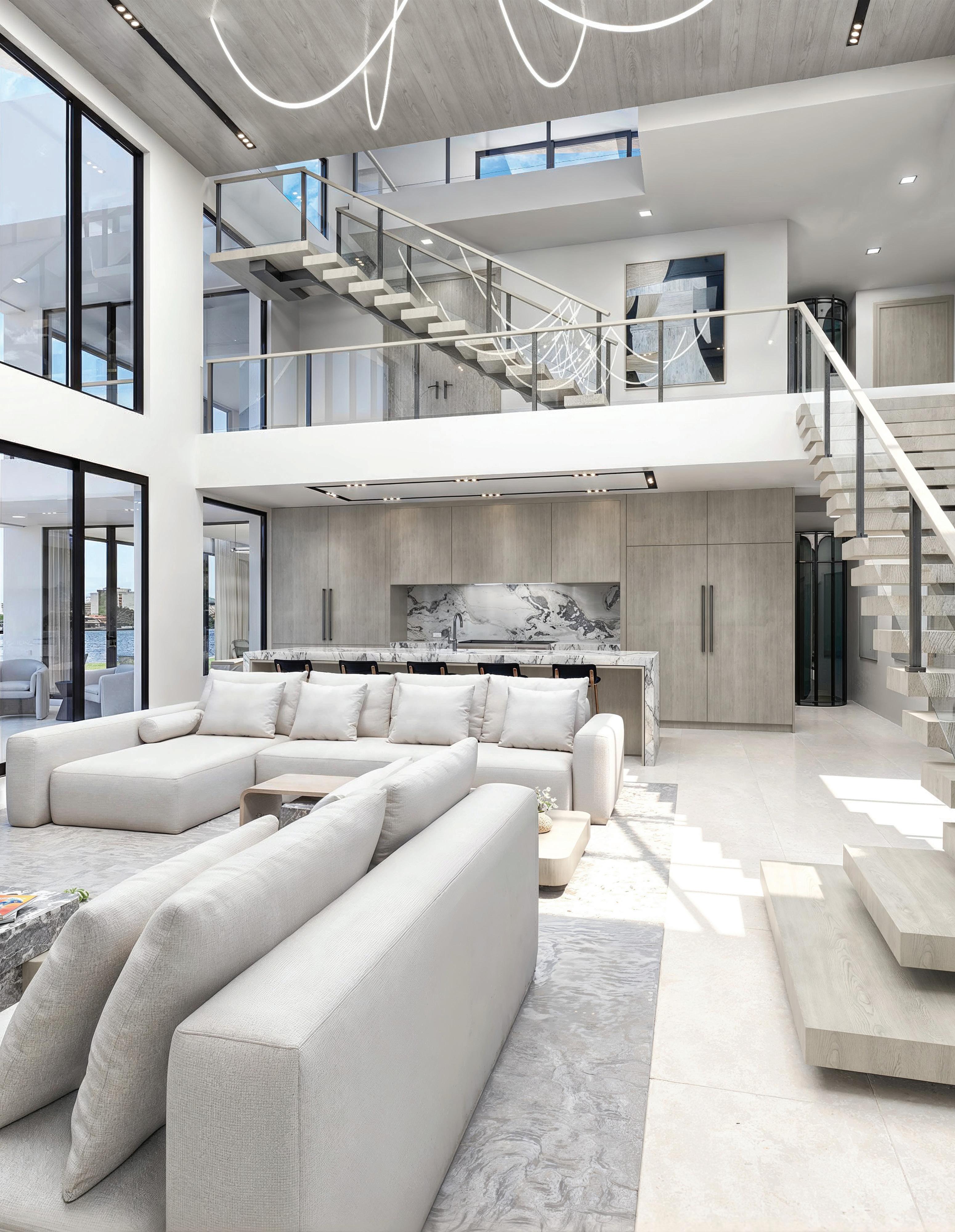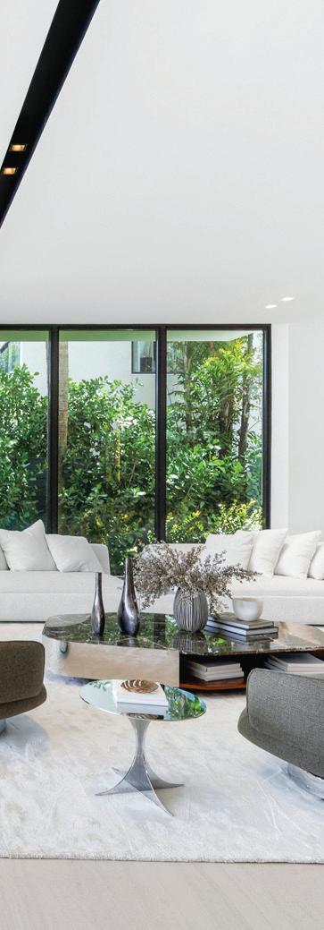 throughout its volumes. “As you enter the house you’re greeted with a double-height wall space that features the bar and sculpted staircase,” Fleischman says. “If you keep walking to the kitchen, you’ll fnd a stone island balanced with the sculpture of the stairs and framed views of the canal.”