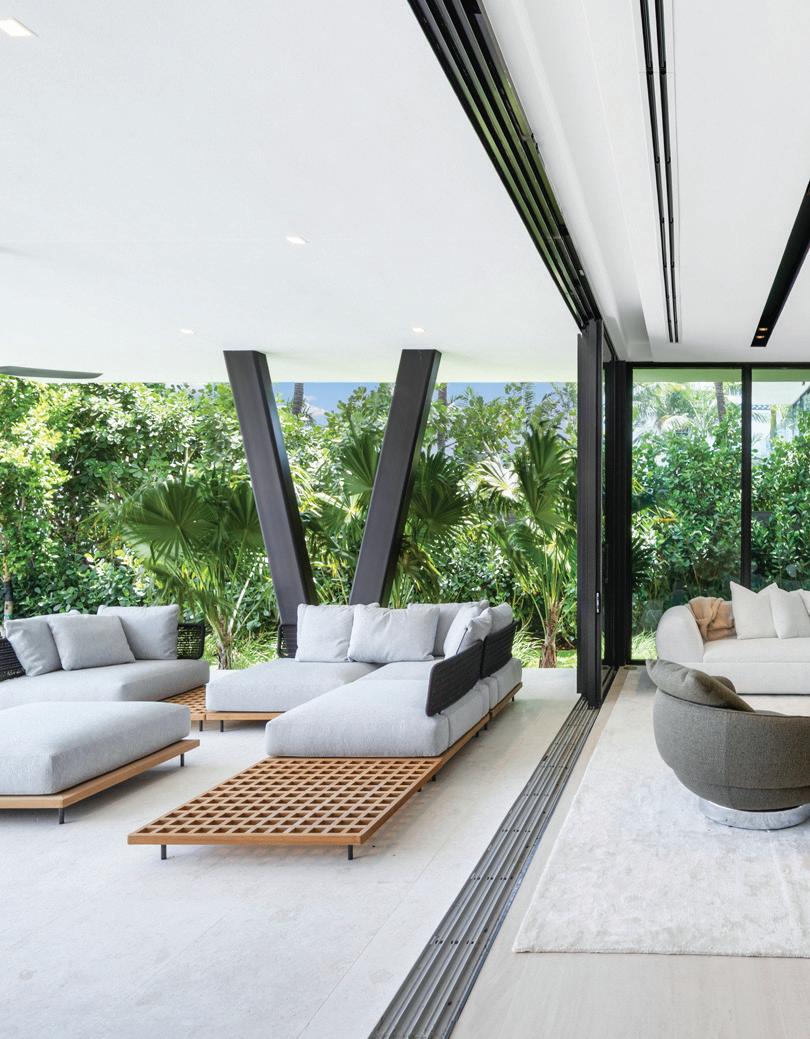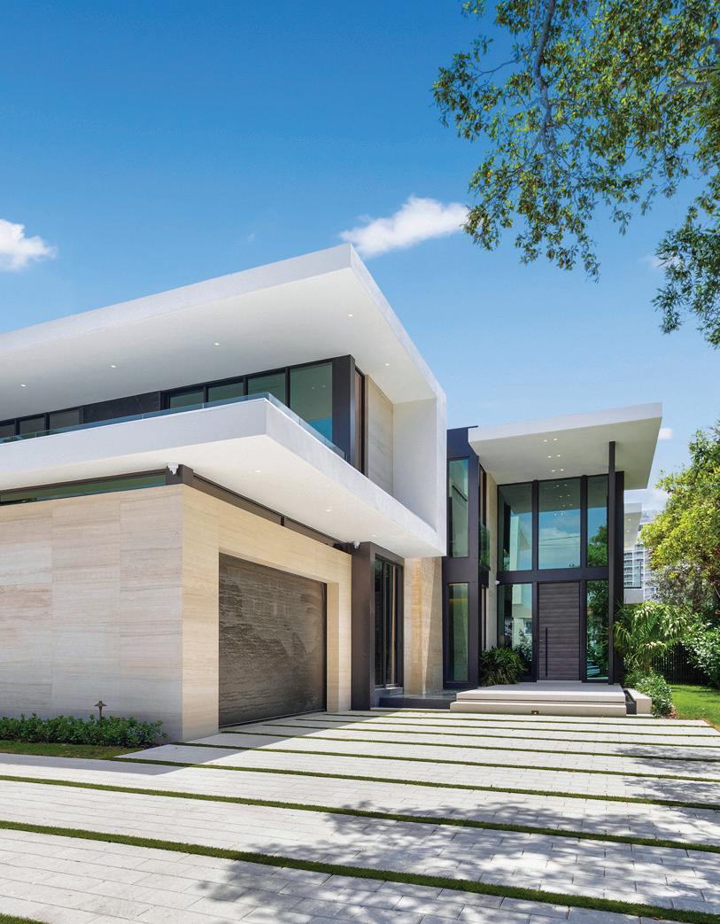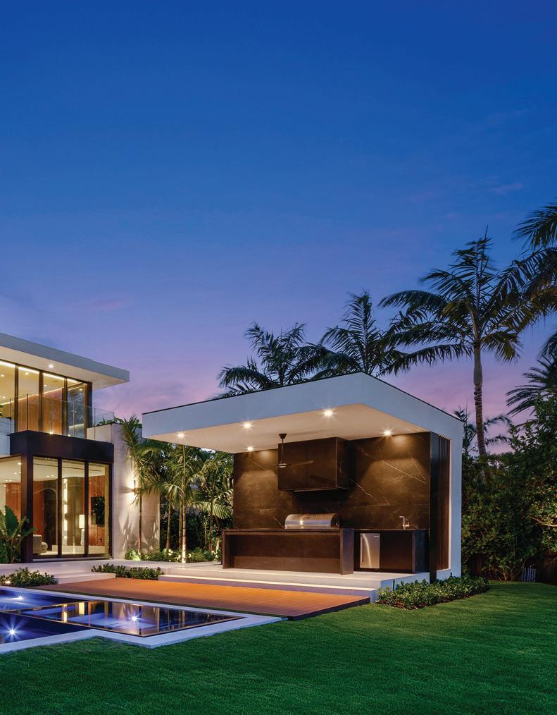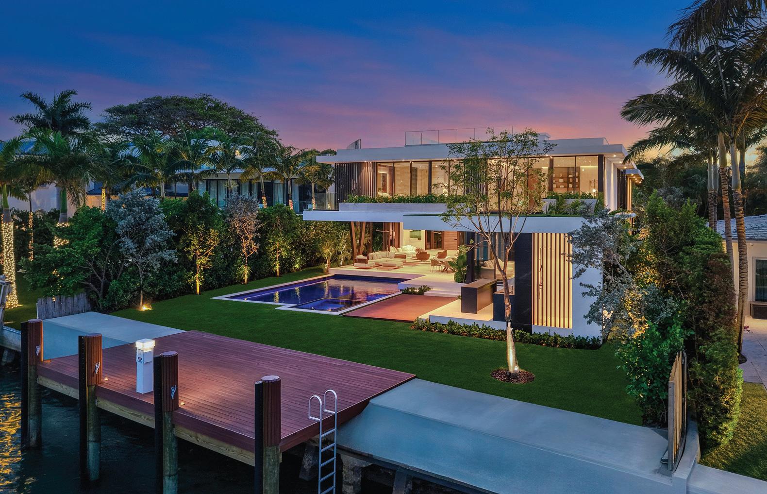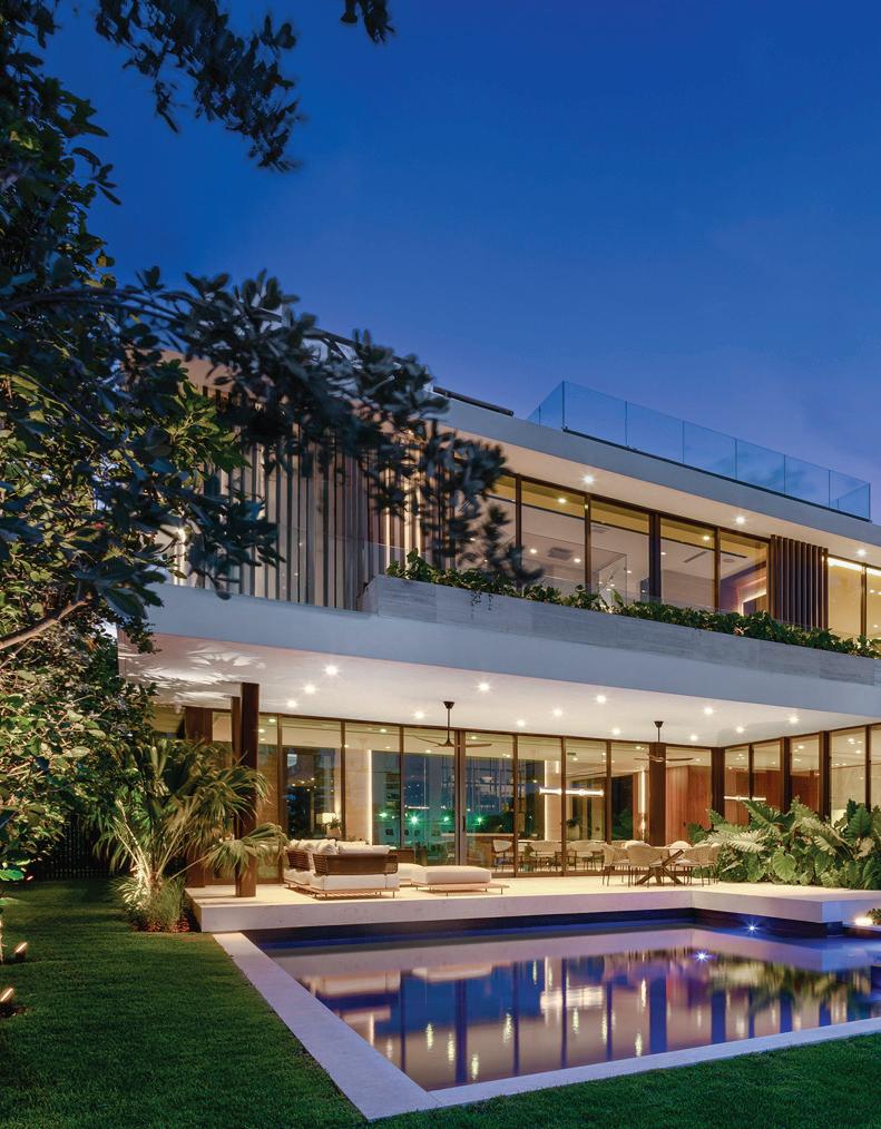 throughout its volumes. “As you enter the house you’re greeted with a double-height wall space that features the bar and sculpted staircase,” Fleischman says. “If you keep walking to the kitchen, you’ll fnd a stone island balanced with the sculpture of the stairs and framed views of the canal.”