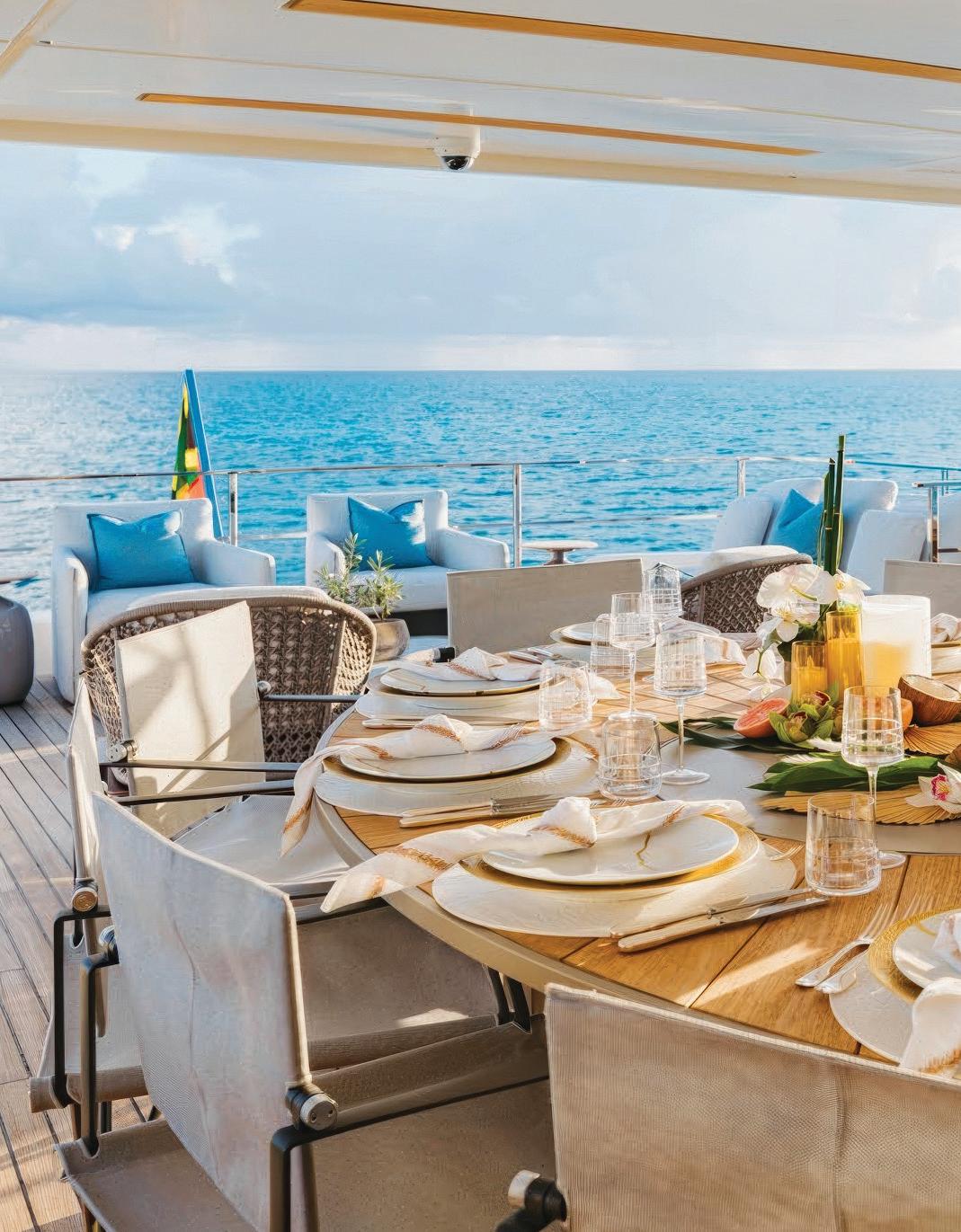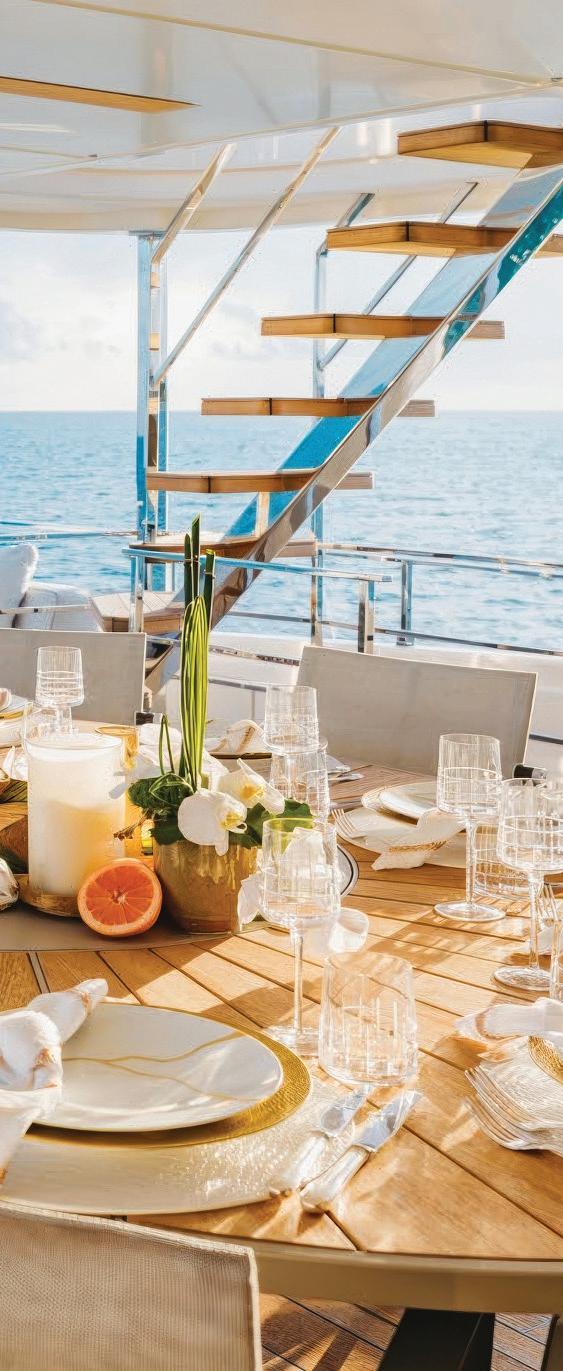 YACHT GUESTS DROPPING ANCHOR OFF ANGUILLA’S MEADS BAY are warmly welcomed at Four Seasons Resort Anguilla. Just steps from the sand, Bamboo Bar & Grill ofers an inviting midday escape think grilled Caribbean seafood, crisp salads, and chilled rosé overlooking the bay. For a livelier scene, head to Sunset Lounge, where Asian-inspired small plates and tropical cocktails are paired with a breezy, DJ-backed ambiance. When the sun sets, SALT offers a refned dinner experience with ocean views and a contemporary menu focused on local seafood. Whether it's a leisurely lunch in the sun or a meal under the stars, dining here is a highlight for day or night.