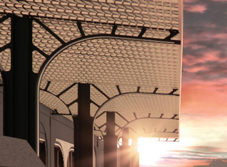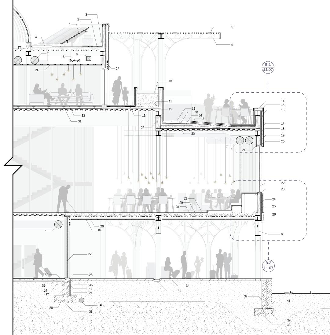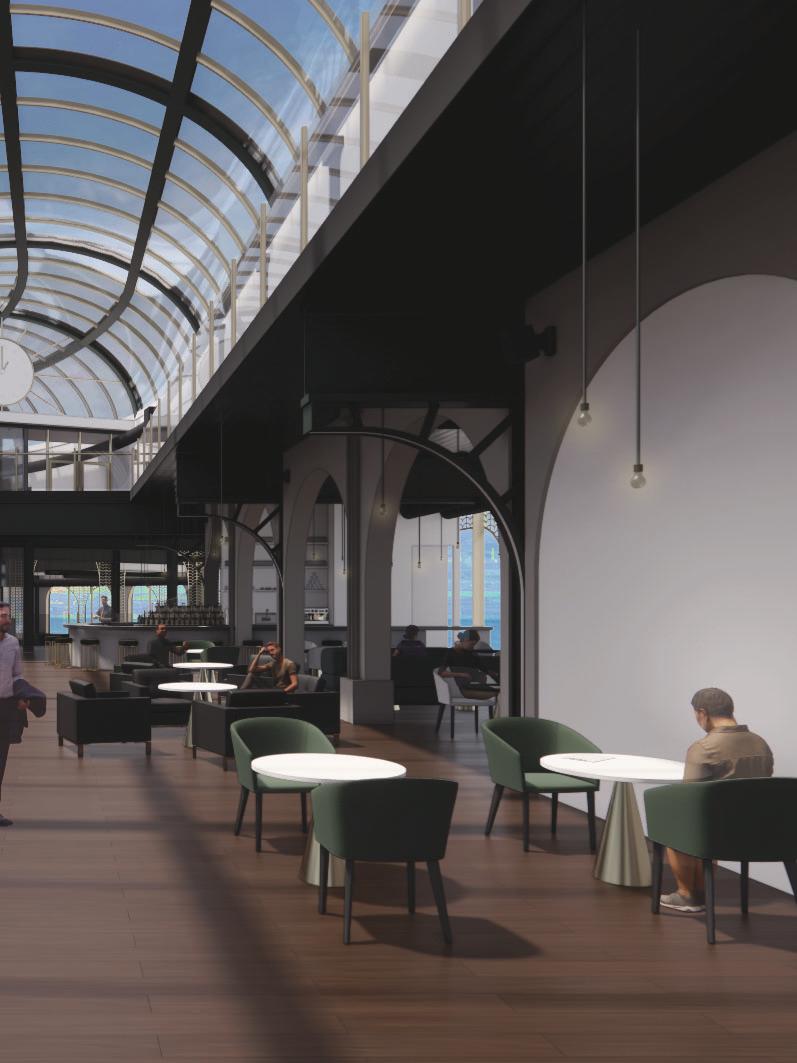 The architecture draws from the historic American station typology while remaining contemporary in assembly and performance. Prefabricated GFRC cladding, exposed steel arches, perforated brass screens, and a barrel-vault skylight create depth, rhythm, and controlled daylight across the public rooms.