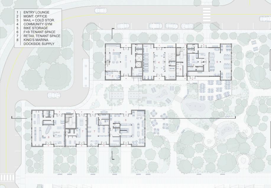 King’s View Apartments is a midrise, mixed-use housing proposal organized around layered thresholds. The ground floor activates the harborwalk with resident-support amenities and small commercial programs, while upper levels group flexible units around the concept of a sheltered outdoor room, intended for year-round use. The architecture focuses on mediation between public and private, exposure and refuge, and largescale development and human-scale dwelling.
