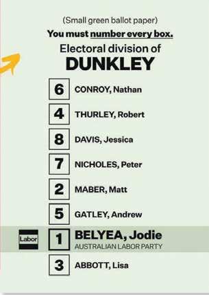 Incumbent Dunkley MP Jodie Belyea will preference the Greens candidate Matt Mader second. Legalise Cannabis candidate Lisa Abbott is third on Labor’s how-to-vote card, and independent Robert Thurley is numbered fourth. Liberal candidate Nathan Conroy is sixth, and One Nation’s Jessica Davis has been placed