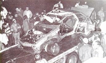 Above left: Russell McRae's wrecked Torana after crashing at Bathurst