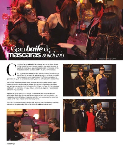 Gran baile de máscaras solidario on motivo de la celebración del carnaval, el Hotel AC Málaga Palacio fue el escenario de un evento benéfico, que quiso recuperar el espíritu de los antiguos grandes bailes de salón venecianos, donde todos los asistentes acudían vestidos de gala y con máscaras. Por iniciativa de la presidenta de la Asociación Amigos de la Espiga, María Piedrola, se realizó un glamuroso evento, en el que los beneficios recaudados fueron para Holystic Pro África, que realiza una gran labor de ayuda en sanidad, educación y deporte, enfocada sobre todo a niños. Más de 350 asistentes pasaron por el photocall decorado para la ocasión por el diseñador de alta costura Javier Alcántara; también fueron varios los colaborares que aportaron su ayuda, como EJ Eventos, Ron Brugal, La Pava, DJ Eventos y esta publicación, en una noche en la que el buen ambiente, la elegancia y la solidaridad estuvieron muy presentes. Además del cóctel ofrecido por el hotel, los asistentes disfrutaron de distintas actividades: desde una pitonisa que leía las cartas del tarot, una caricaturista o un maquillador corporal, hasta un mago que asombró con sus trucos a los asistentes, y todo, con la mejor música como acompañamiento. Sin duda, una noche de baile y glamour que seguro que se convertirá en un evento referente en la capital malagueña en las próximas ediciones del carnaval.