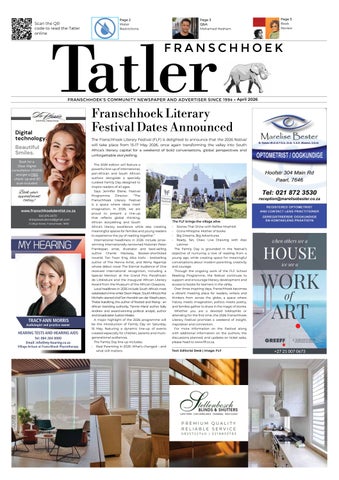 The Franschhoek Tatler is the Franschhoek Valley's free monthly community newspaper. Since its inception in 1994 it has been a valued part of Franschhoek’s social fabric. Readers enjoy its inclusive no-nonsense approach and varied content – from community news and 'hard' news stories everybody in Franschhoek should know about to environmental matters, food & wine, events and more. The Franschhoek Tatler is published on the 1st of each month. It is delivered to all PO Boxes in Franschhoek and La Motte, some street addresses, most B&Bs, Guest Houses, Hotels and Wineries in the Franschhoek Valley and is available at shops, supermarkets, restaurants and the tourist information offices in Franschhoek and Stellenbosch. It is also sent to overseas and South African subscribers. The Franschhoek Tatler is published by Schafer Media CC and is the sister publication of Franschhoek Style – a quarterly glossy lifestyle publication. See www.franschhoekstyle.co.za for more on Franschhoek Style.