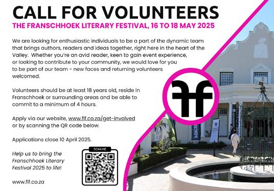 The final word belongs to Charl Celliers, 1988 Head Boy and Chairman of the Reunion Organising Committee: “This unforgettable oncein-a-lifetime festival weekend promises to be the event of the century for Franschhoek—its residents, Franschhoek High School alumni and – indeed - all who have fond memories of Franschhoek. We urge everyone to support the various offerings during the weekend of 26 and 27 September 2025, as well as the lead-up projects, to support Franschhoek High School and address its immediate needs.”