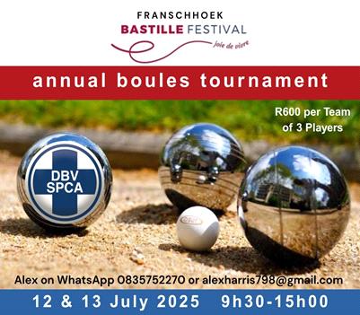 ‘Pat’s’ Bastille Boule Competition It is with sadness that we heared of the passing of one of our long ser ving suppor ters, Pat M o rg a n T h a n k yo u to a l l a t H o s p i c e wh o organised a ver y befitting memorial for Pat. She would be pleased that "her" boule competition is being organised by Franschhoek Boule Club. Please come along to play or suppor t during the Bastille Festival. Great prizes can be won and lots of fun is to be had. Please contact Alex Harris for details - 083 575 2270