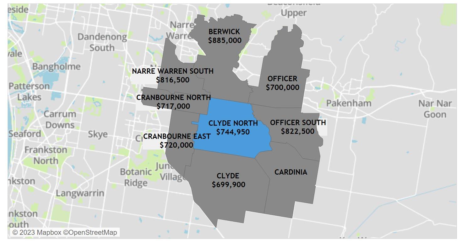 The 2022 median house price in Clyde North was $738,000 The neighbouring suburb of Berwick recorded a notably higher median price of $875,000, in line with metropolitan Melbourne ($875K) and well above the broader Casey LGA ($742K).