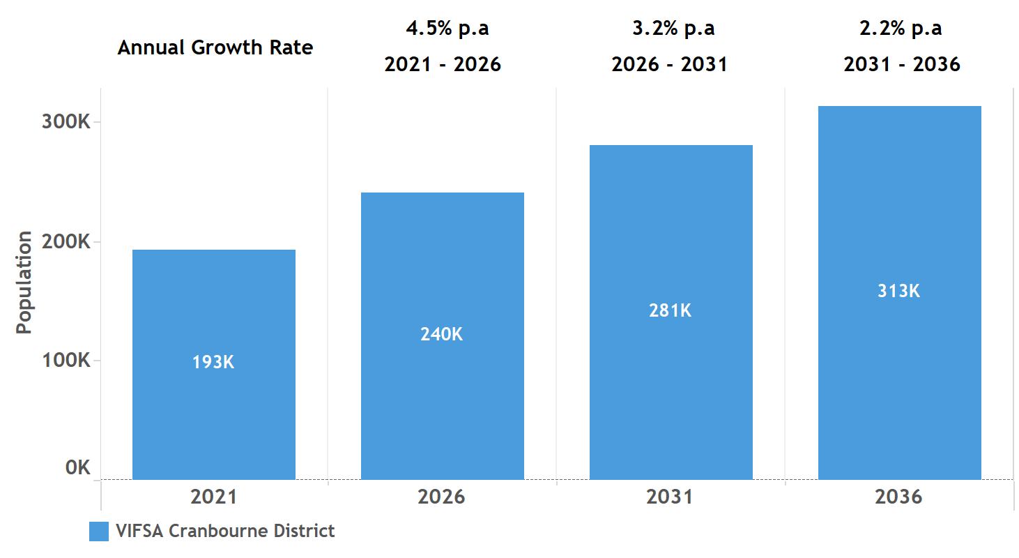 Based on the Victoria in Future (VIF) 2019 projections, the population in the Cranbourne District VIFSA* is forecast to grow considerably to 2036. At +3.3% p.a., average annual growth is set to outpace metropolitan Melbourne (+1.7% p.a.)