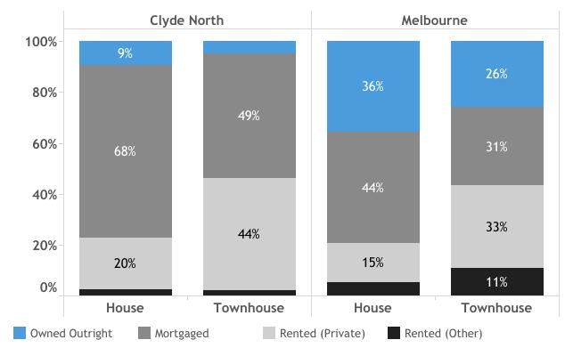 In comparison to metropolitan Melbourne, a greater proportion of dwellings in Clyde North are currently being purchased or rented.