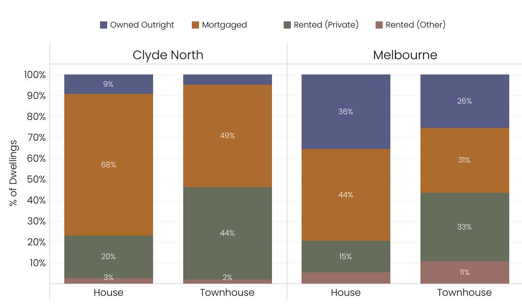 In comparison to Metropolitan Melbourne, a greater proportion of dwellings in Clyde North are currently mortgaged or rented.