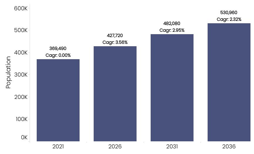 Based on the Victoria in Future (VIF) 2023 projections, the population in the Casey LGA is forecast to grow considerably to 2036. At 2.4% p.a. over the period 20212036, average growth is set to outpace Metropolitan Melbourne (1.8% p.a.).