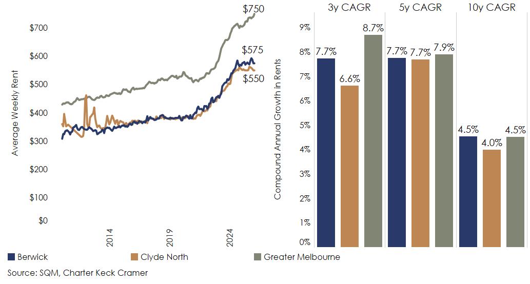 As at January 2026, the median weekly rent for a three-bedroom house in Clyde North and Berwick was $550 and $575 p.w. respectively. This was significantly more affordable than the Metropolitan Melbourne equivalent of $750 p.w.