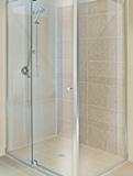 Semi framed shower screens with powder coated aluminium frame (polished silver finish) and clear glazed pivot door.