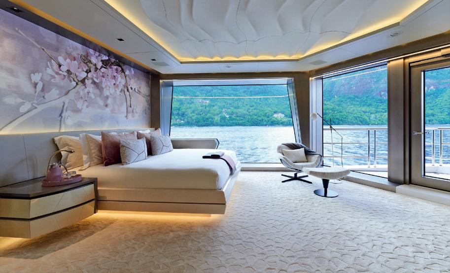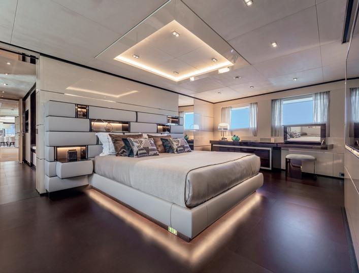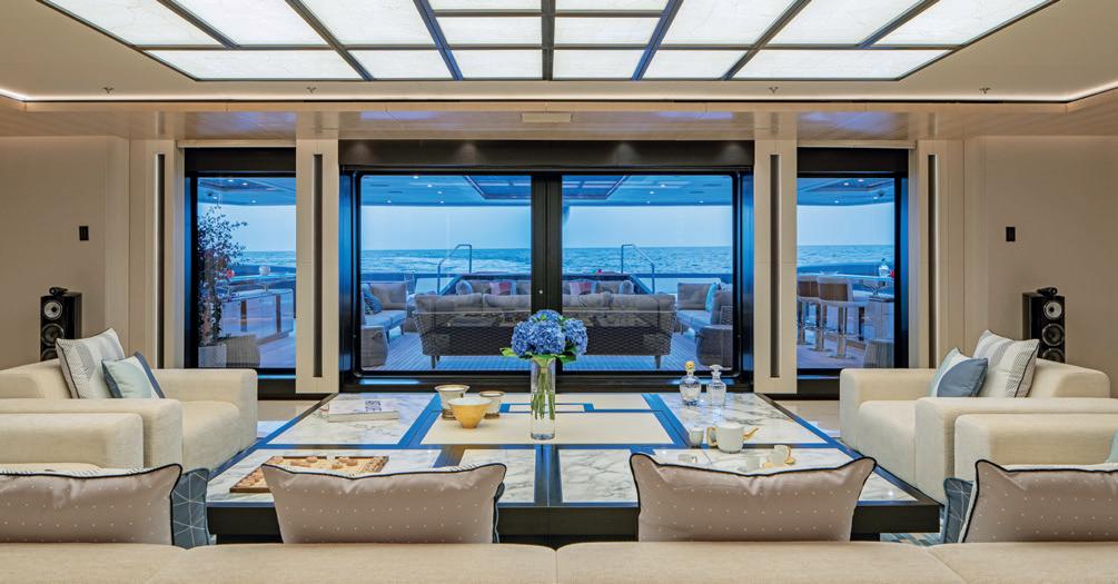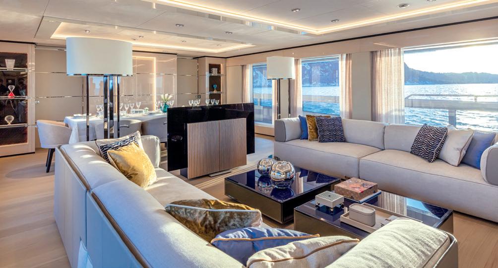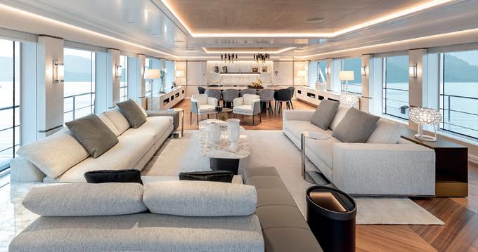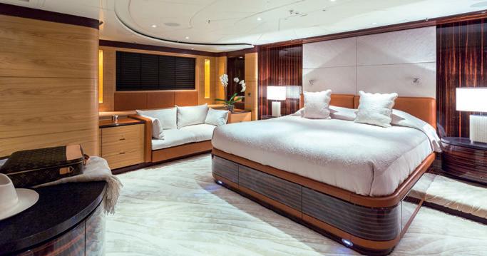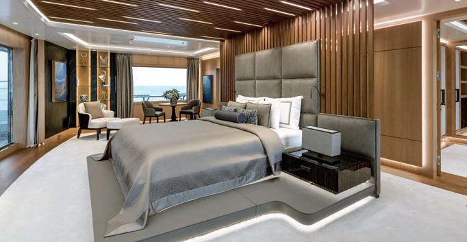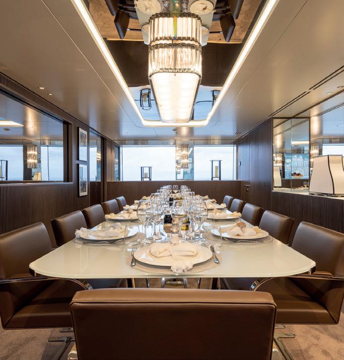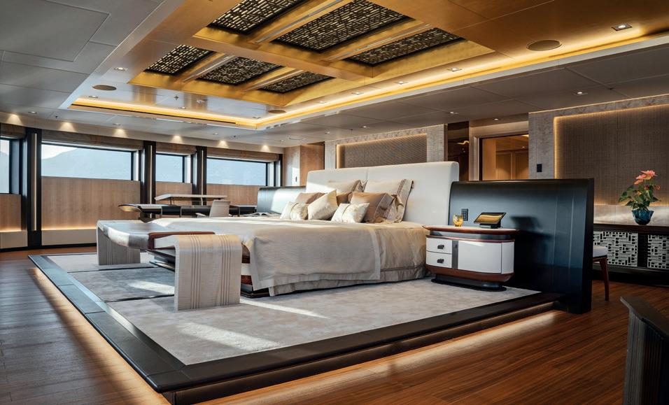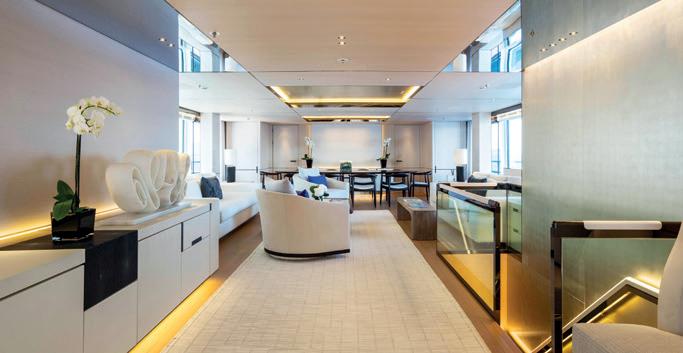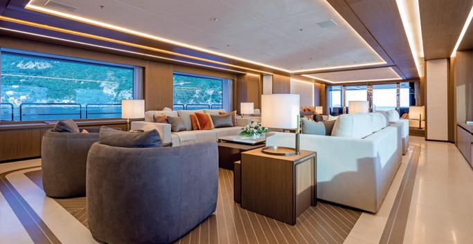 Nearby in Winterswijk, at Heesen’s dedicated yacht interiors workshop, over 130 craftspeople busy away, from draftsmen to cabinet-makers, and upholsterers to French polishers, passing their expertise down through the generations. Aboard 37M/122’ AURELIA (for sale and charter, pg 183), named after the first Gran Turismo with an eye-catching Gulf Oil Racing paint scheme, her automotive design by Bannenberg & Rowell is reflected in mesh infills to suggest radiator grilles and thick stainless steel drawer pulls with knurled detailing, all custom-made by Heesen.