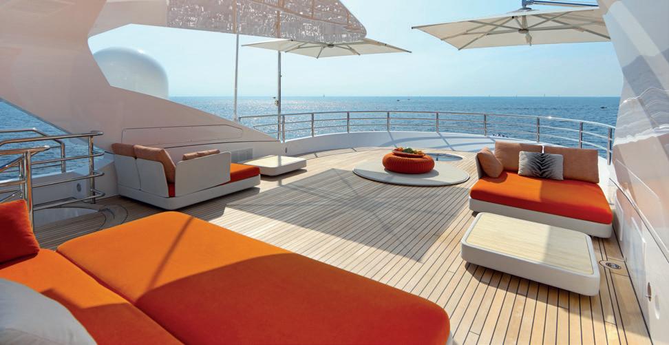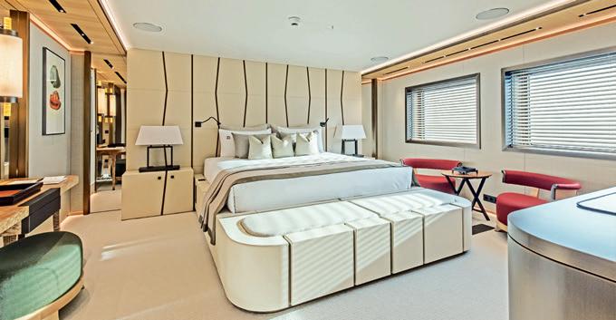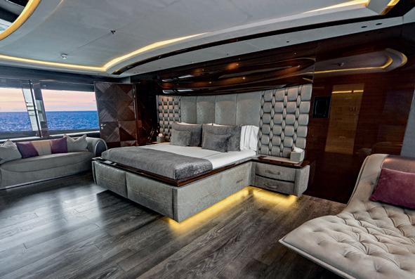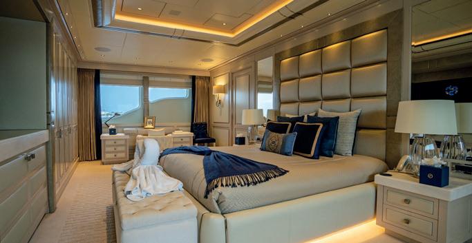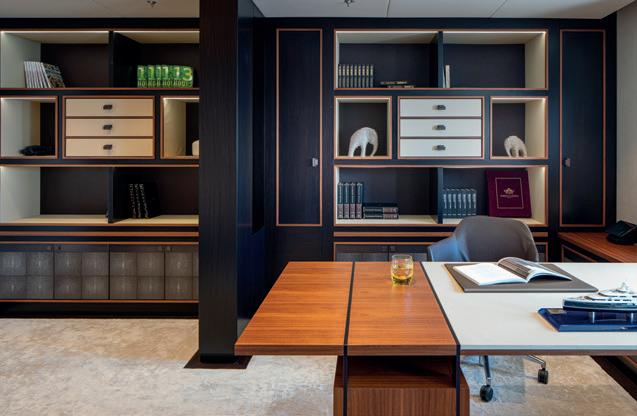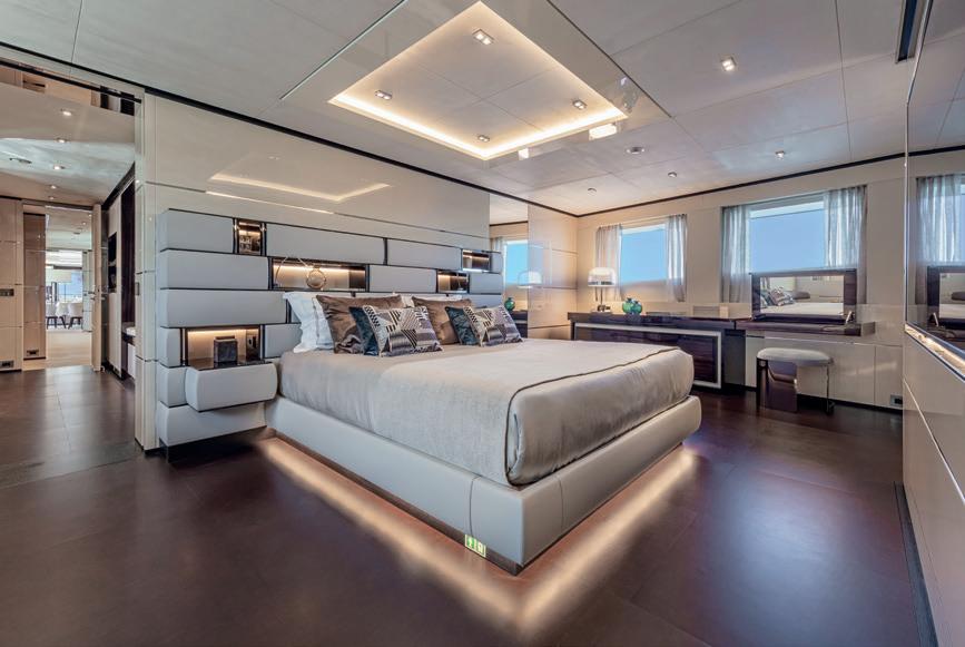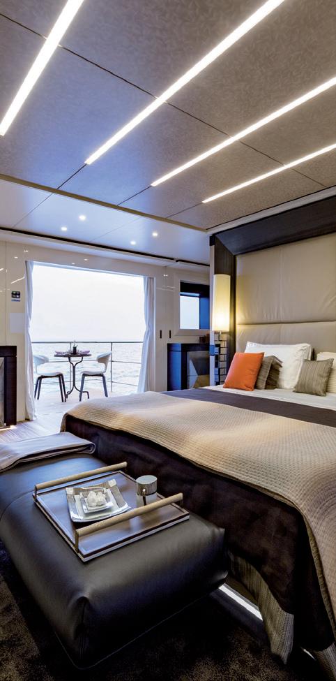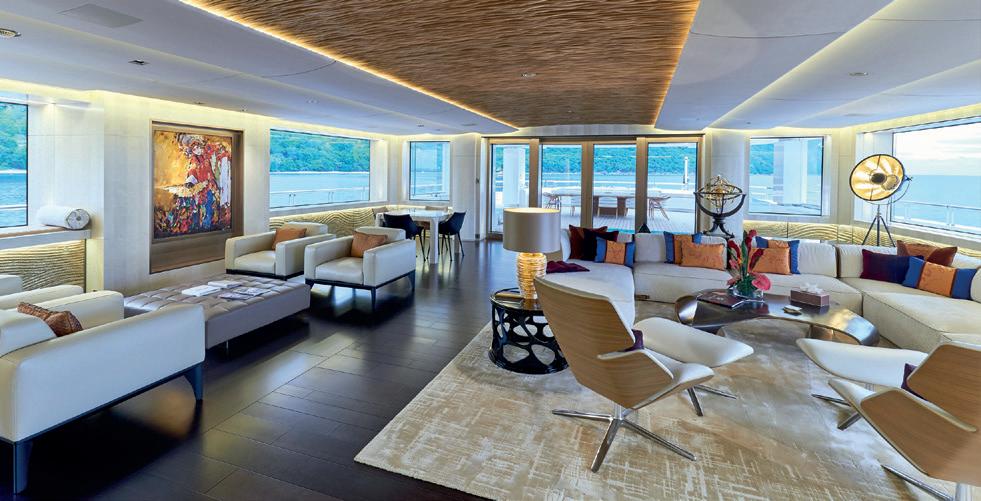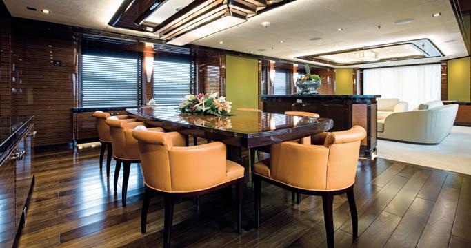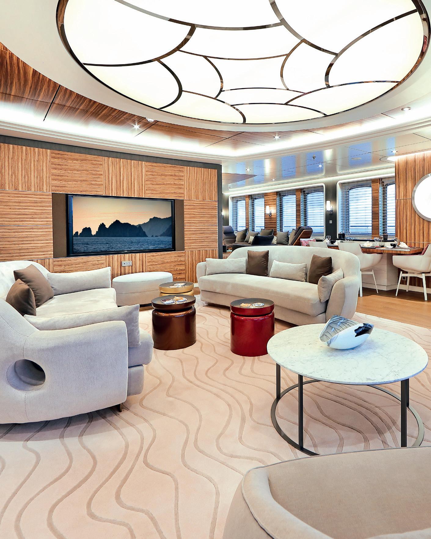 Nearby in Winterswijk, at Heesen’s dedicated yacht interiors workshop, over 130 craftspeople busy away, from draftsmen to cabinet-makers, and upholsterers to French polishers, passing their expertise down through the generations. Aboard 37M/122’ AURELIA (for sale and charter, pg 183), named after the first Gran Turismo with an eye-catching Gulf Oil Racing paint scheme, her automotive design by Bannenberg & Rowell is reflected in mesh infills to suggest radiator grilles and thick stainless steel drawer pulls with knurled detailing, all custom-made by Heesen.