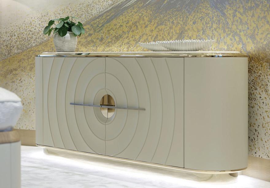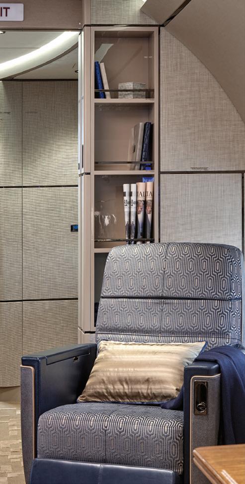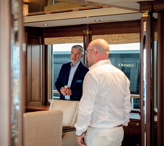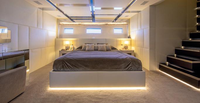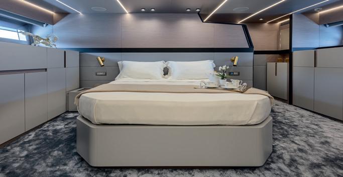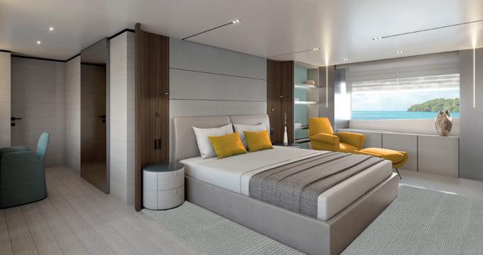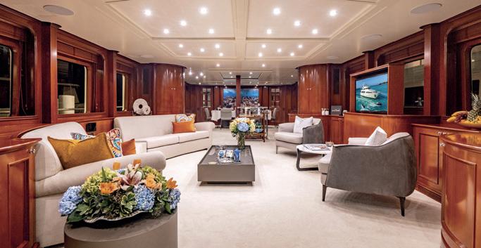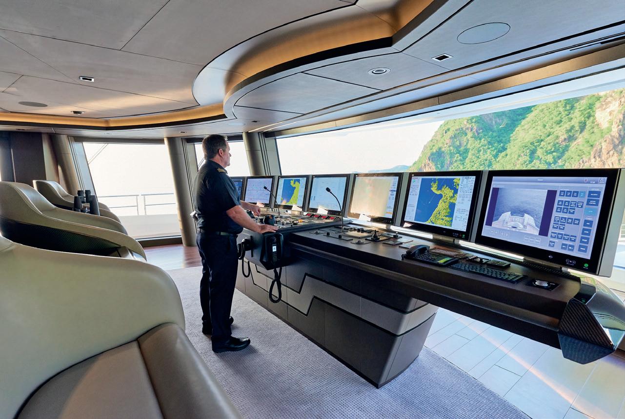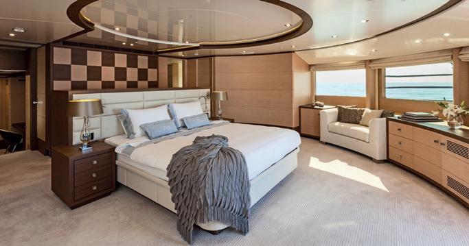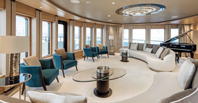 Nearby in Winterswijk, at Heesen’s dedicated yacht interiors workshop, over 130 craftspeople busy away, from draftsmen to cabinet-makers, and upholsterers to French polishers, passing their expertise down through the generations. Aboard 37M/122’ AURELIA (for sale and charter, pg 183), named after the first Gran Turismo with an eye-catching Gulf Oil Racing paint scheme, her automotive design by Bannenberg & Rowell is reflected in mesh infills to suggest radiator grilles and thick stainless steel drawer pulls with knurled detailing, all custom-made by Heesen.
