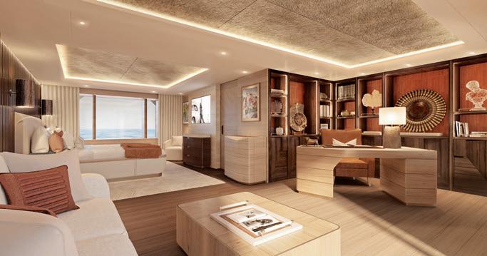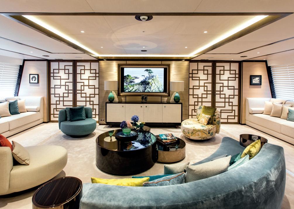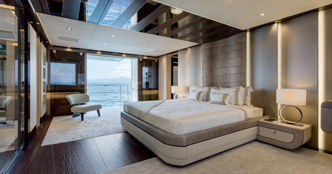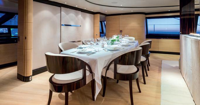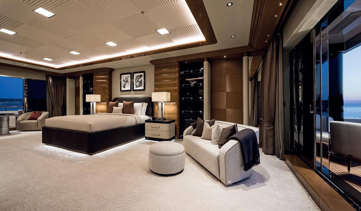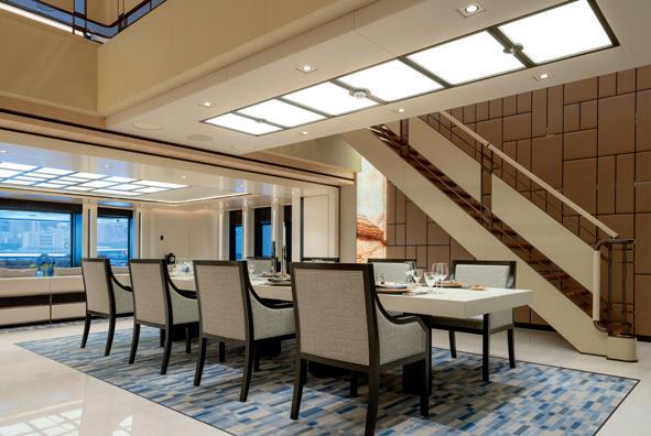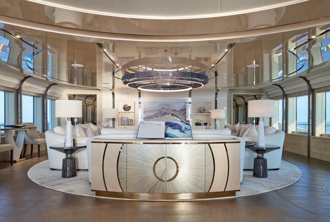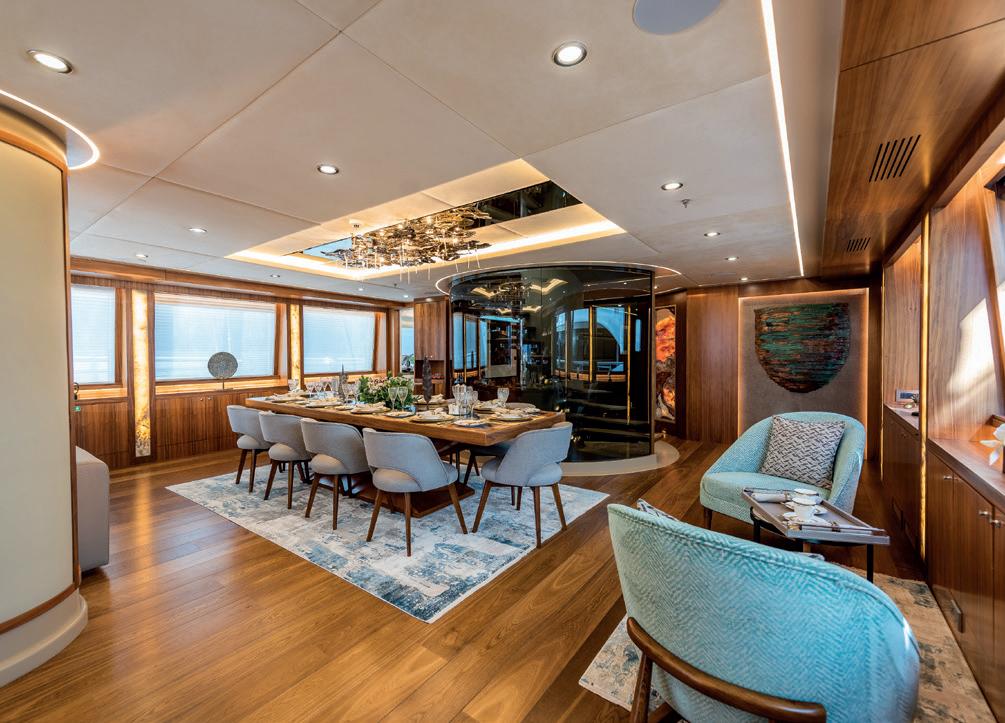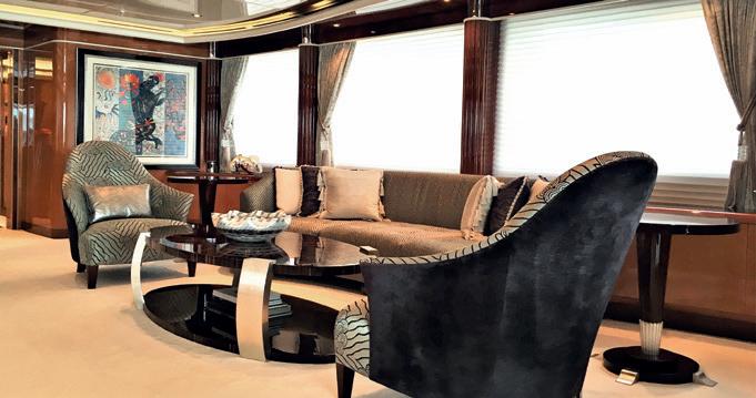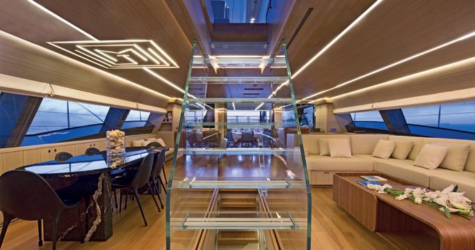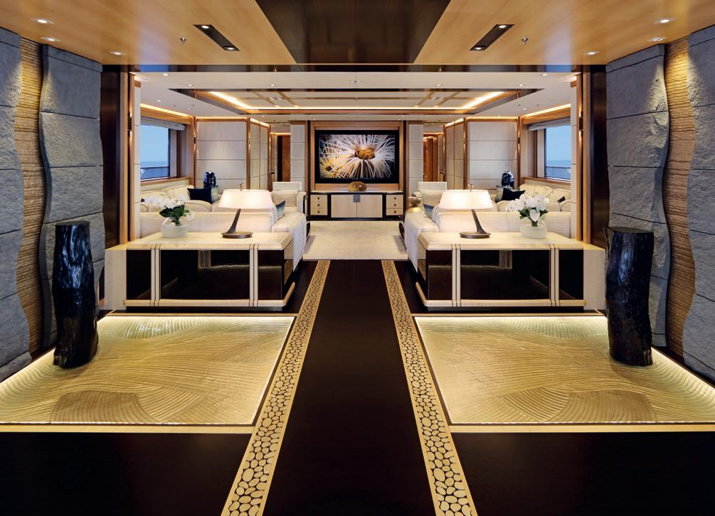 Alongside space, the Owners find comfort in the straight-grain dark walnut floors, taupe ripple fiddle-back sycamore walls, and hand gilded wall glass panels by DKT Artwork. “Our decorative finishes adapt to what the client needs,” says Guglielmo Carrozzo, DKT’s head of marketing. “But a key area that remains the centrepiece aboard any yacht is the staircase. It’s one of the few places where you can tell a story that transitions through the decks.”