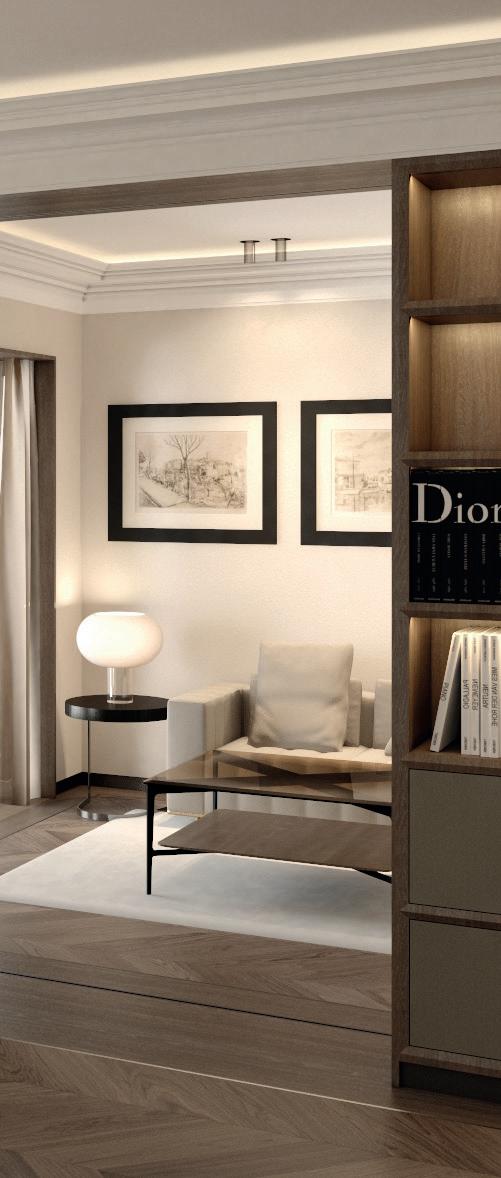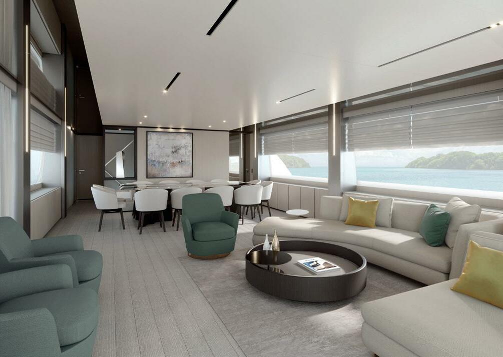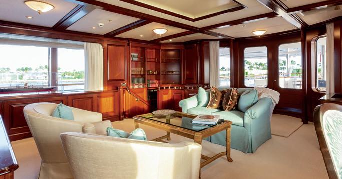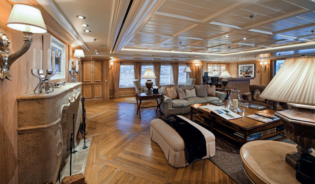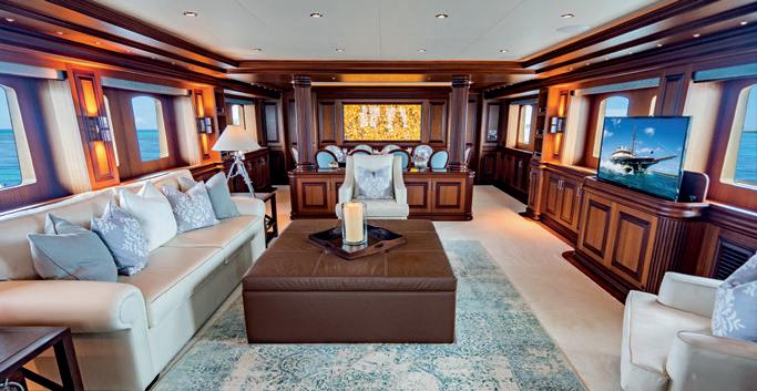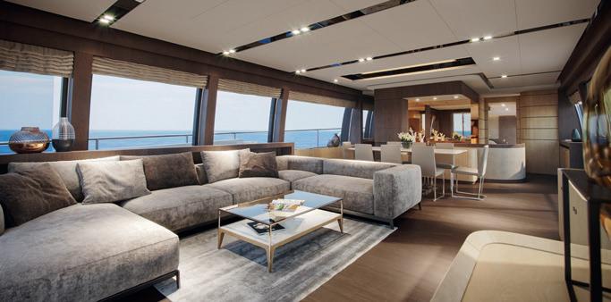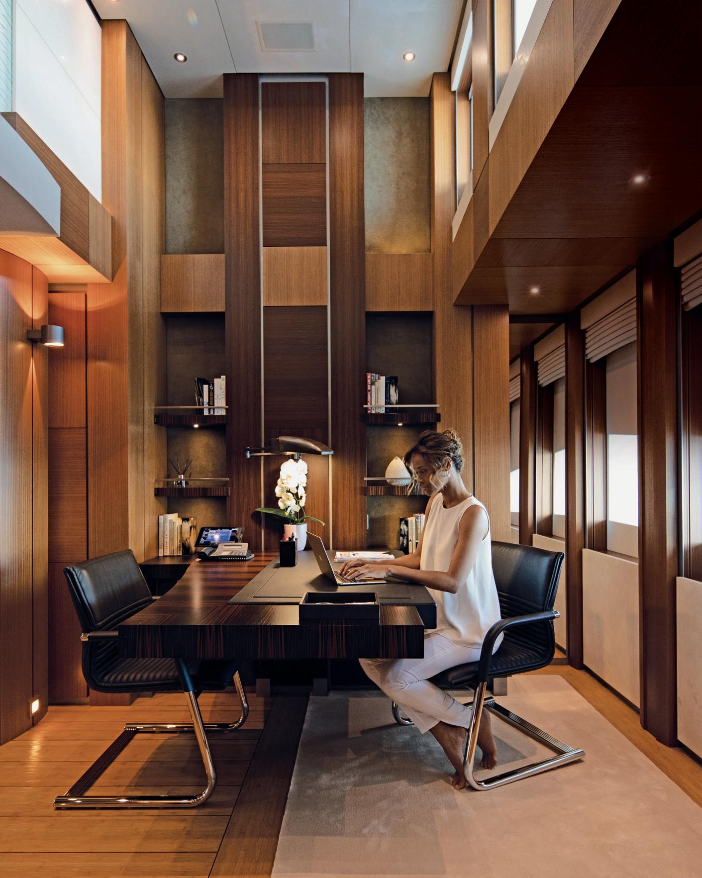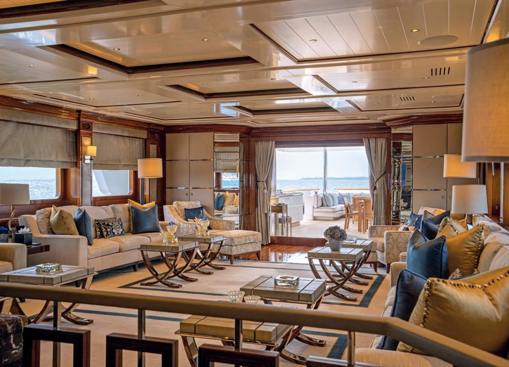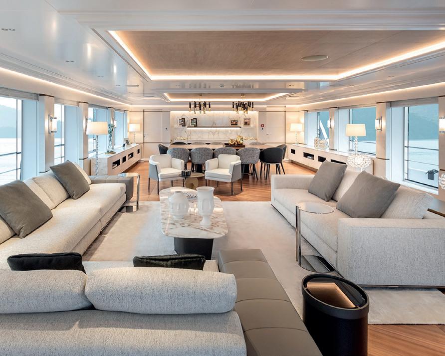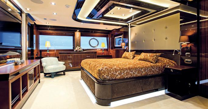 Alongside space, the Owners find comfort in the straight-grain dark walnut floors, taupe ripple fiddle-back sycamore walls, and hand gilded wall glass panels by DKT Artwork. “Our decorative finishes adapt to what the client needs,” says Guglielmo Carrozzo, DKT’s head of marketing. “But a key area that remains the centrepiece aboard any yacht is the staircase. It’s one of the few places where you can tell a story that transitions through the decks.”